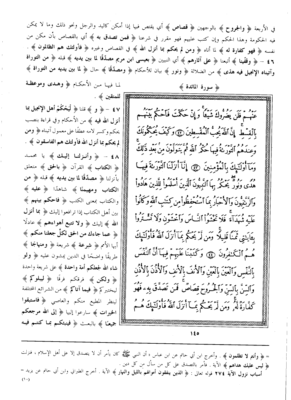 {وَكَتَبْنَا} فَرَضْنَا {عَلَيْهِمْ فِيهَا} أَيْ التَّوْرَاة {أَنَّ النفس} تقتل {بالنفس} إذا قتلتها {والعين} تفقأ {بالعين والأنف} يجدع {بالأنف والأذن} تقطع {بالأذن والسن} تقلع {بالسن} وَفِي قِرَاءَة بِالرَّفْعِ فِي الْأَرْبَعَة {وَالْجُرُوح} بِالْوَجْهَيْنِ {قِصَاص} أَيْ يُقْتَصّ فِيهَا إذَا أَمْكَنَ كَالْيَدِ وَالرِّجْل وَنَحْو ذَلِكَ وَمَا لَا يُمْكِن فِيهِ الْحُكُومَة وَهَذَا الْحُكْم وَإِنْ كَتَبَ عَلَيْهِمْ فَهُوَ مُقَرَّر فِي شَرْعنَا {فَمَنْ تَصَدَّقَ بِهِ} أَيْ بِالْقِصَاصِ بِأَنْ مَكَّنَ مِنْ نَفْسه {فَهُوَ كَفَّارَة لَهُ} لِمَا أَتَاهُ {وَمَنْ لَمْ يَحْكُم بِمَا أنزل الله} في القصاص وغيره {فأولئك هم الظالمون}
