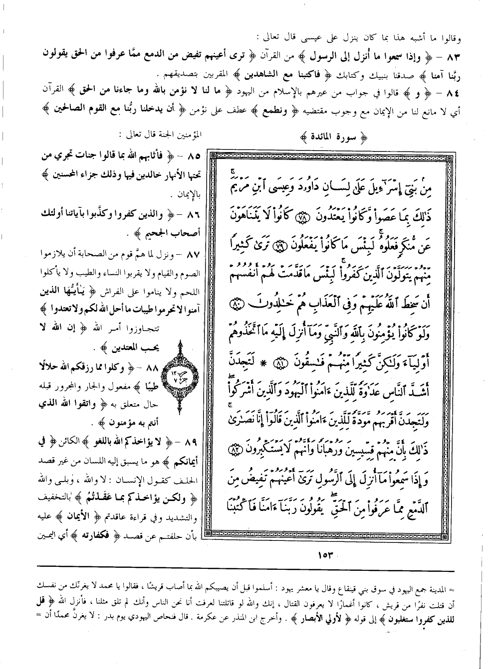 {لَتَجِدَن} يَا مُحَمَّد {أَشَدّ النَّاس عَدَاوَة لِلَّذِينَ آمَنُوا الْيَهُود وَاَلَّذِينَ أَشْرَكُوا} مِنْ أَهْل مَكَّة لِتَضَاعُفِ كُفْرهمْ وَجَهْلهمْ وَانْهِمَاكهمْ فِي اتِّبَاع الْهَوَى {وَلَتَجِدَن أَقْرَبهمْ مَوَدَّة لِلَّذِينَ آمَنُوا الَّذِينَ قَالُوا إنَّا نَصَارَى ذَلِكَ} أَيْ قُرْب مَوَدَّتهمْ لِلْمُؤْمِنِينَ {بِأَنَّ} بِسَبَبِ أَنَّ {مِنْهُمْ قِسِّيسِينَ} عُلَمَاء {وَرُهْبَانًا} عُبَّادًا {وَأَنَّهُمْ لَا يَسْتَكْبِرُونَ} عَنْ اتِّبَاع الْحَقّ كَمَا يَسْتَكْبِر الْيَهُود وَأَهْل مَكَّة نَزَلَتْ فِي وَفْد النَّجَاشِيّ الْقَادِمِينَ عَلَيْهِ مِنْ الْحَبَشَة قَرَأَ صَلَّى اللَّه عَلَيْهِ وَسَلَّمَ سُورَة يس فَبَكَوْا وَأَسْلَمُوا وَقَالُوا مَا أَشْبَه هَذَا بِمَا كَانَ ينزل على عيسى قال تعالى