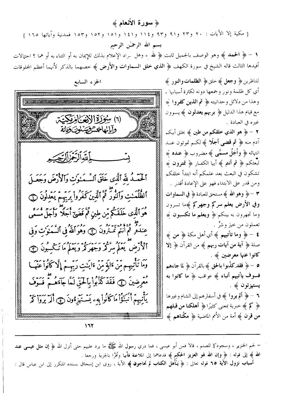 {الْحَمْد} وَهُوَ الْوَصْف بِالْجَمِيلِ ثَابِت {لِلَّهِ} وَهَلْ الْمُرَاد الْإِعْلَام بِذَلِك لِلْإِيمَانِ بِهِ أَوْ الثَّنَاء بِهِ أَوْ هُمَا احْتِمَالَات أَفْيَدهَا الثَّالِث قَالَهُ الشَّيْخ فِي سُورَة الْكَهْف {الَّذِي خَلَقَ السَّمَاوَات وَالْأَرْض} خَصَّهُمَا بِالذِّكْرِ لِأَنَّهُمَا أَعْظَم الْمَخْلُوقَات لِلنَّاظِرِينَ {وَجَعَلَ} خَلَقَ {الظُّلُمَات وَالنُّور} أَي كُلّ ظُلْمَة وَنُور وَجَمَعَهَا دُونه لِكَثْرَةِ أَسْبَابهَا وَهَذَا مِنْ دَلَائِل وَحْدَانِيّته {ثُمَّ الَّذِينَ كَفَرُوا} مَعَ قِيَام هَذَا الدَّلِيل {بِرَبِّهِمْ يَعْدِلُونَ} يُسَوُّونَ غَيْره فِي العبادة