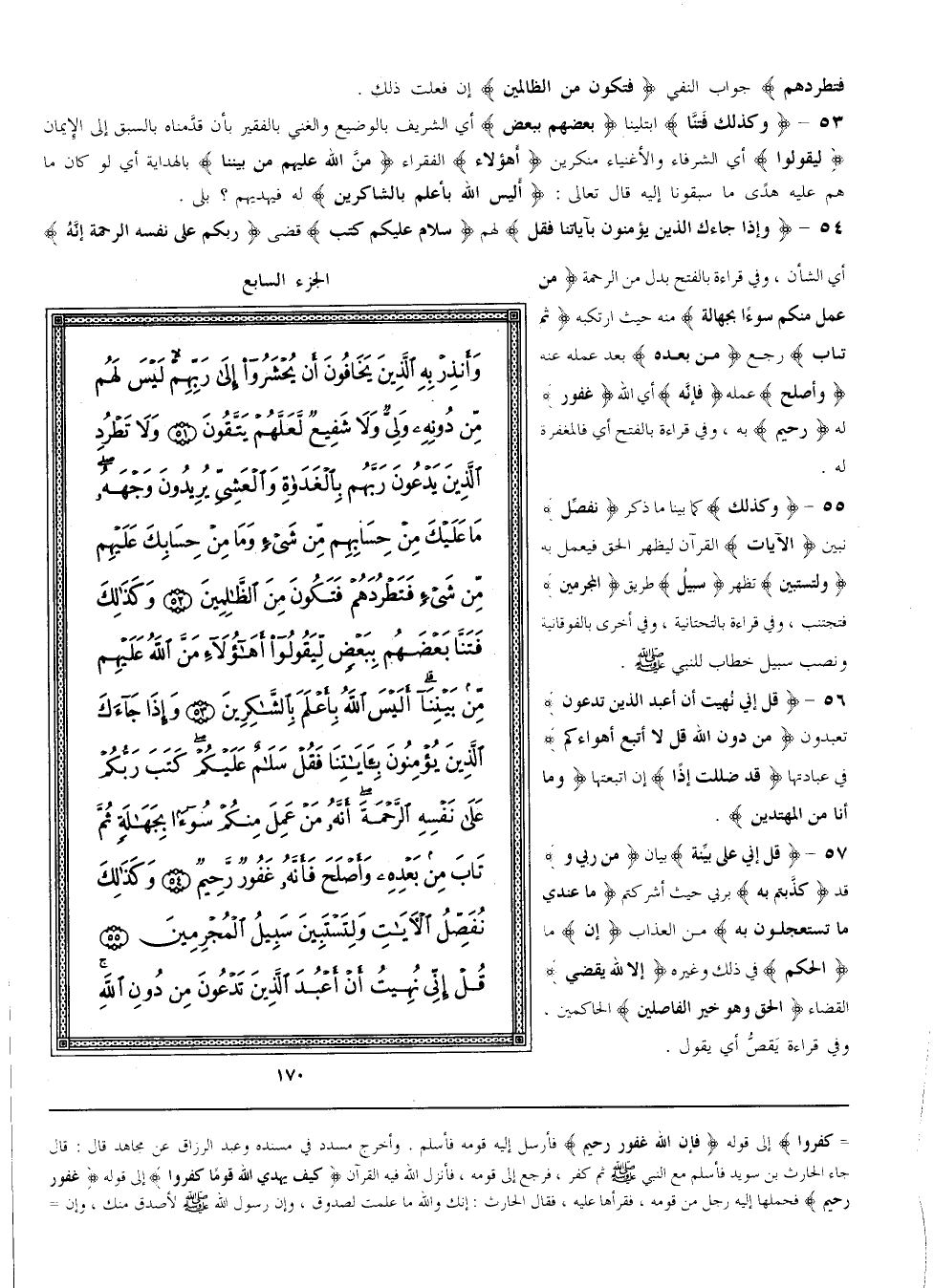 {وَلَا تَطْرُد الَّذِينَ يَدْعُونَ رَبّهمْ بِالْغَدَاةِ وَالْعَشِيّ يُرِيدُونَ} بِعِبَادَتِهِمْ {وَجْهه} تَعَالَى لَا شَيْئًا مِنْ أَعْرَاض الدُّنْيَا وَهُمْ الْفُقَرَاء وَكَانَ الْمُشْرِكُونَ طَعَنُوا فِيهِمْ وَطَلَبُوا أَنْ يَطْرُدهُمْ لِيُجَالِسُوهُ وَأَرَادَ النَّبِيّ صَلَّى اللَّه عَلَيْهِ وَسَلَّمَ ذَلِكَ طَمَعًا فِي إسْلَامهمْ {مَا عَلَيْك مِنْ حِسَابهمْ مِنْ} زَائِدَة {شَيْء} إنْ كَانَ بَاطِنهمْ غَيْر مَرْضِيّ {وَمَا مِنْ حِسَابك عَلَيْهِمْ مِنْ شَيْء فَتَطْرُدهُمْ} جَوَاب النَّفْي {فَتَكُون مِنْ الظَّالِمِينَ} إنْ فَعَلْت ذَلِكَ