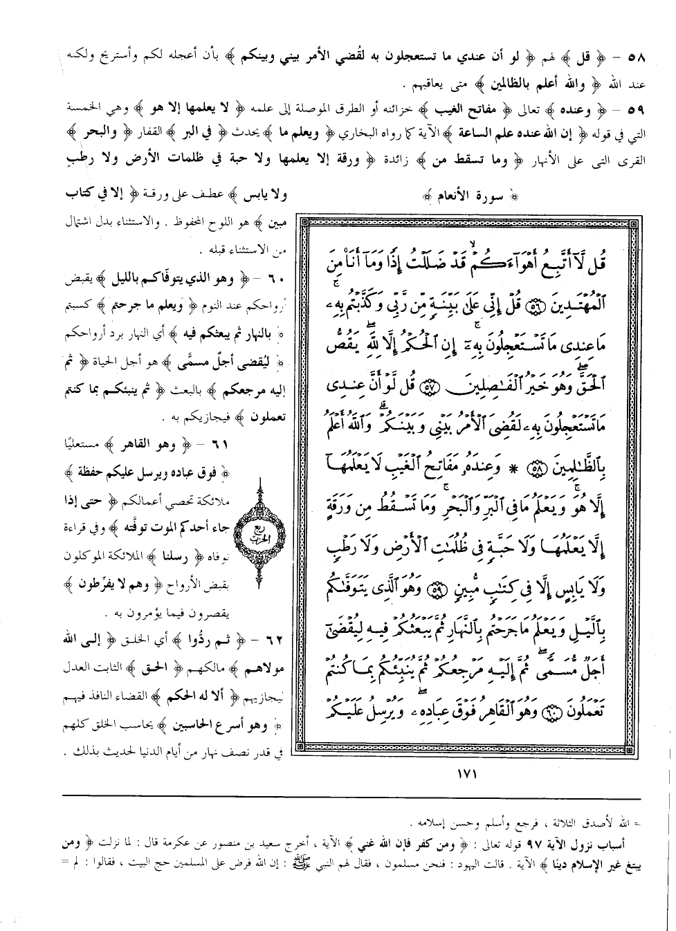{وَعِنْده} تَعَالَى {مَفَاتِح الْغَيْب} خَزَائِنه أَوْ الطُّرُق الْمُوَصِّلَة إلَى عِلْمه {لَا يَعْلَمهَا إلَّا هُوَ} وَهِيَ الْخَمْسَة الَّتِي فِي قَوْله {إنَّ اللَّه عِنْده عِلْم السَّاعَة} الْآيَة كَمَا رَوَاهُ الْبُخَارِيّ {وَيَعْلَم مَا} يَحْدُث {فِي الْبَرّ} الْقِفَار {وَالْبَحْر} الْقُرَى الَّتِي عَلَى الْأَنْهَار {وَمَا تَسْقُط مِنْ} زَائِدَة {وَرَقَة إلَّا يَعْلَمهَا وَلَا حَبَّة فِي ظُلُمَات الْأَرْض وَلَا رَطْب وَلَا يَابِس} عُطِفَ عَلَى وَرَقَة {إلَّا فِي كِتَاب مُبِين} هُوَ اللَّوْح الْمَحْفُوظ وَالِاسْتِثْنَاء بَدَل اشْتِمَال مِنْ الِاسْتِثْنَاء قبله