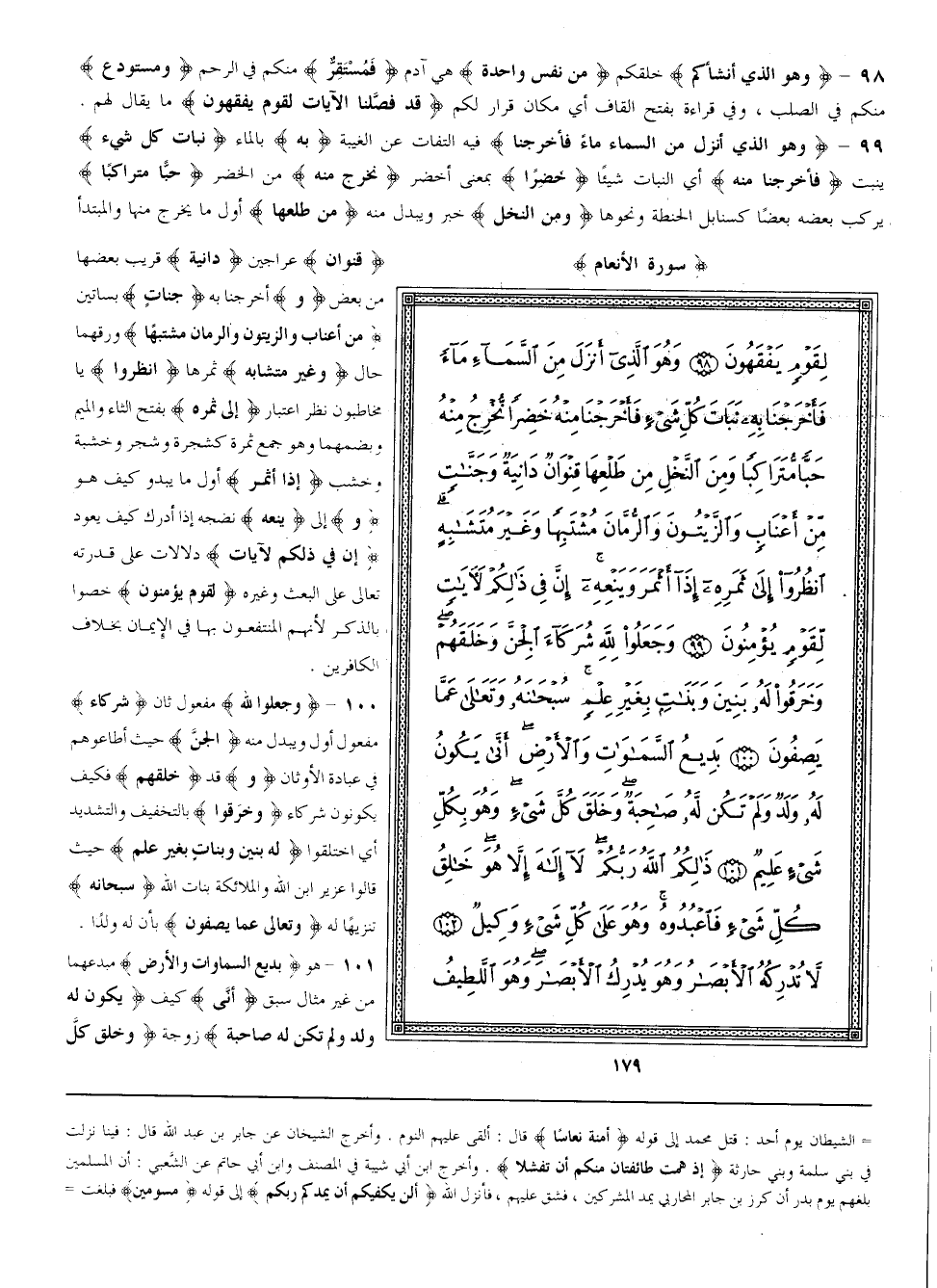 {وَهُوَ الَّذِي أَنْزَلَ مِنْ السَّمَاء مَاء فَأَخْرَجْنَا} فِيهِ الْتِفَات عَنْ الْغَيْبَة {بِهِ} بِالْمَاءِ {نَبَات كُلّ شَيْء} يَنْبُت {فَأَخْرَجْنَا مِنْهُ} أَيْ النَّبَات شَيْئًا {خَضِرًا} بِمَعْنَى أَخْضَر {نُخْرِج مِنْهُ} مِنْ الْخَضِر {حَبًّا مُتَرَاكِبًا} يَرْكَب بَعْضه بَعْضًا كَسَنَابِل الْحِنْطَة وَنَحْوهَا {وَمِنْ النَّخْل} خَبَر وَيُبْدَل مِنْهُ {مِنْ طَلْعهَا} أَوَّل مَا يَخْرُج مِنْهَا وَالْمُبْتَدَأ {قِنْوَان} عَرَاجِين {دَانِيَة} قَرِيب بَعْضهَا مِنْ بَعْض {و} أخرجنا به {جنات} بَسَاتِين {مِنْ أَعْنَاب وَالزَّيْتُون وَالرُّمَّان مُشْتَبِهًا} وَرَقهمَا حَال {وَغَيْر مُتَشَابِه} ثَمَرهَا {اُنْظُرُوا} يَا مُخَاطَبُونَ نَظَرَ اعْتِبَار {إلَى ثَمَره} بِفَتْحِ الثَّاء وَالْمِيم وَبِضَمِّهِمَا وَهُوَ جَمْع ثَمَرَة كَشَجَرَةٍ وَشَجَر وَخَشَبَة وَخَشَب {إذَا أَثْمَرَ} أَوَّل مَا يَبْدُو كَيْفَ هو {و} إلى {ينعه} نُضْجه إذَا أَدْرَكَ كَيْفَ يَعُود {إنَّ فِي ذَلِكُمْ لَآيَات} دَلَالَات عَلَى قُدْرَته تَعَالَى عَلَى الْبَعْث وَغَيْره {لِقَوْمٍ يُؤْمِنُونَ} خُصُّوا بِالذِّكْرِ لِأَنَّهُمْ الْمُنْتَفِعُونَ بِهَا فِي الْإِيمَان بِخِلَافِ الْكَافِرِينَ