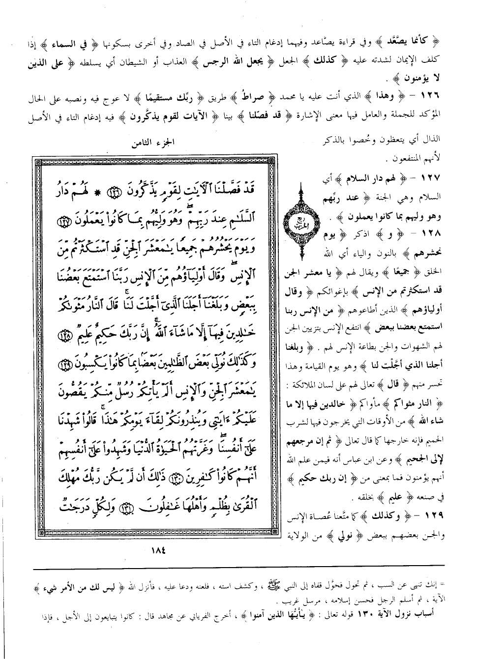 {فَمَنْ يُرِدْ اللَّه أَنْ يَهْدِيه يَشْرَح صَدْره لِلْإِسْلَامِ} بِأَنْ يَقْذِف فِي قَلْبه نُورًا فَيَنْفَسِح لَهُ وَيَقْبَلهُ كَمَا وَرَدَ فِي حَدِيث {وَمَنْ يُرِدْ} اللَّه {أَنْ يُضِلّهُ يَجْعَل صَدْره ضَيِّقًا} بِالتَّخْفِيفِ وَالتَّشْدِيد عَنْ قَبُوله {حَرَجًا} شَدِيد الضِّيق بِكَسْرِ الرَّاء صِفَة وَفَتْحهَا مَصْدَر وَصَفَ فِيهِ مُبَالَغَة {كَأَنَّمَا يَصَّعَّد} وَفِي قِرَاءَة يَصَّاعَد وَفِيهِمَا إدْغَام التَّاء فِي الْأَصْل فِي الصَّاد وَفِي أُخْرَى بِسُكُونِهَا {فِي السَّمَاء} إذَا كُلِّفَ الْإِيمَان لِشِدَّتِهِ عَلَيْهِ {كَذَلِكَ} الْجَعْل {يَجْعَل اللَّه الرِّجْس} العذاب أو الشيطان أي يسلطه {على الذين لا يؤمنون}