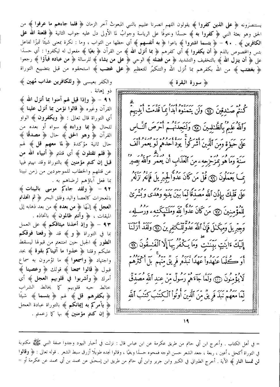 {وَلَمَّا جَاءَهُمْ كِتَاب مِنْ عِنْد اللَّه مُصَدِّق لِمَا مَعَهُمْ} مِنْ التَّوْرَاة هُوَ الْقُرْآن {وَكَانُوا من قبل} قبل مجيئه {يستفتحون} يستنصرونه {عَلَى الَّذِينَ كَفَرُوا} يَقُولُونَ اللَّهُمَّ اُنْصُرْنَا عَلَيْهِمْ بِالنَّبِيِّ الْمَبْعُوث آخِر الزَّمَان {فَلَمَّا جَاءَهُمْ مَا عَرَفُوا} مِنْ الْحَقّ وَهُوَ بَعْثَة النَّبِيّ {كَفَرُوا بِهِ} حَسَدًا وَخَوْفًا عَلَى الرِّيَاسَة وَجَوَاب لَمَّا الْأُولَى دَلَّ عَلَيْهِ جَوَاب الثَّانِيَة {فلعنة الله على الكافرين}