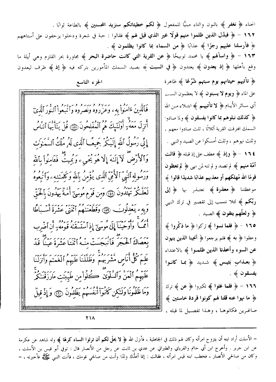 {وَاسْأَلْهُمْ} يَا مُحَمَّد تَوْبِيخًا {عَنْ الْقَرْيَة الَّتِي كَانَتْ حَاضِرَة الْبَحْر} مُجَاوِرَة بَحْر الْقُلْزُم وَهِيَ أَيْلَة مَا وَقَعَ بِأَهْلِهَا {إذْ يَعْدُونَ} يَعْتَدُونَ {فِي السَّبْت} بِصَيْدِ السَّمَك الْمَأْمُورِينَ بِتَرْكِهِ فِيهِ {إذْ} ظَرْف لِيَعْدُونَ {تَأْتِيهِمْ حِيتَانهمْ يَوْم سَبْتهمْ شُرَّعًا} ظَاهِرَة عَلَى الْمَاء {وَيَوْم لَا يَسْبِتُونَ} لَا يُعَظِّمُونَ السَّبْت أَيْ سَائِر الْأَيَّام {لَا تَأْتِيهِمْ} ابْتِلَاء مِنْ اللَّه {كَذَلِكَ نَبْلُوهُمْ بِمَا كَانُوا يَفْسُقُونَ} وَلَمَّا صَادُوا السَّمَك افْتَرَقَتْ الْقَرْيَة أَثَلَاثًا ثُلُث صَادُوا مَعَهُمْ وَثُلُث نَهَوْهُمْ وَثُلُث أَمْسَكُوا عَنْ الصَّيْد وَالنَّهْي