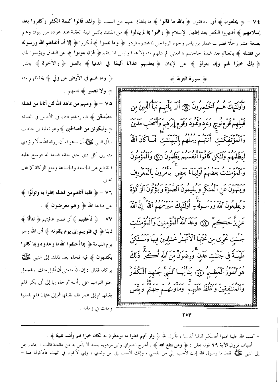 {وَمِنْهُمْ مَنْ عَاهَدَ اللَّه لَئِنْ آتَانَا مِنْ فَضْله لَنَصَّدَّقَنَّ} فِيهِ إدْغَام التَّاء فِي الْأَصْل فِي الصَّاد {وَلَنَكُونَنَّ مِنْ الصَّالِحِينَ} وَهُوَ ثَعْلَبَة بْن حَاطِب سَأَلَ النَّبِيّ صَلَّى اللَّه عَلَيْهِ وَسَلَّمَ أَنْ يَدْعُو لَهُ أَنْ يَرْزُقهُ اللَّه مالا ويؤدي منه إلى كُلّ ذِي حَقّ حَقّه فَدَعَا لَهُ فَوَسَّعَ عَلَيْهِ فَانْقَطَعَ عَنْ الْجُمُعَة وَالْجَمَاعَة وَمَنَعَ الزَّكَاة كما قال تعالى
