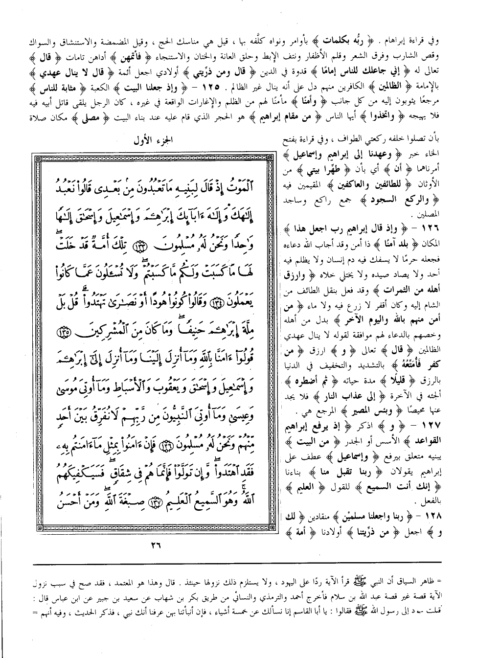 {وَ} اُذْكُرْ {إذْ ابْتَلَى} اخْتَبَرَ {إبْرَاهِيمَ} وَفِي قِرَاءَة إبْرَاهَام {رَبُّهُ بِكَلِمَاتٍ} بِأَوَامِر وَنَوَاهٍ كَلَّفَهُ بِهَا قِيلَ هِيَ مَنَاسِك الْحَجّ وَقِيلَ الْمَضْمَضَة وَالِاسْتِنْشَاق وَالسِّوَاك وَقَصّ الشَّارِب وَفَرْق الشَّعْر وَقَلْم الإظفار ونتف الإبط وحلق العانة والختان والاستنجاء {فَأَتَمّهنَّ} أَدَّاهُنَّ تَامَّات {قَالَ} تَعَالَى لَهُ {إنِّي جَاعِلك لِلنَّاسِ إمَامًا} قُدْوَة فِي الدِّين {قَالَ وَمِنْ ذُرِّيَّتِي} أَوْلَادِي اجْعَلْ أَئِمَّة {قَالَ لَا يَنَال عَهْدِي} بِالْإِمَامَةِ {الظَّالِمِينَ} الْكَافِرِينَ مِنْهُمْ دَلَّ عَلَى أَنَّهُ يَنَال غَيْر الظَّالِم