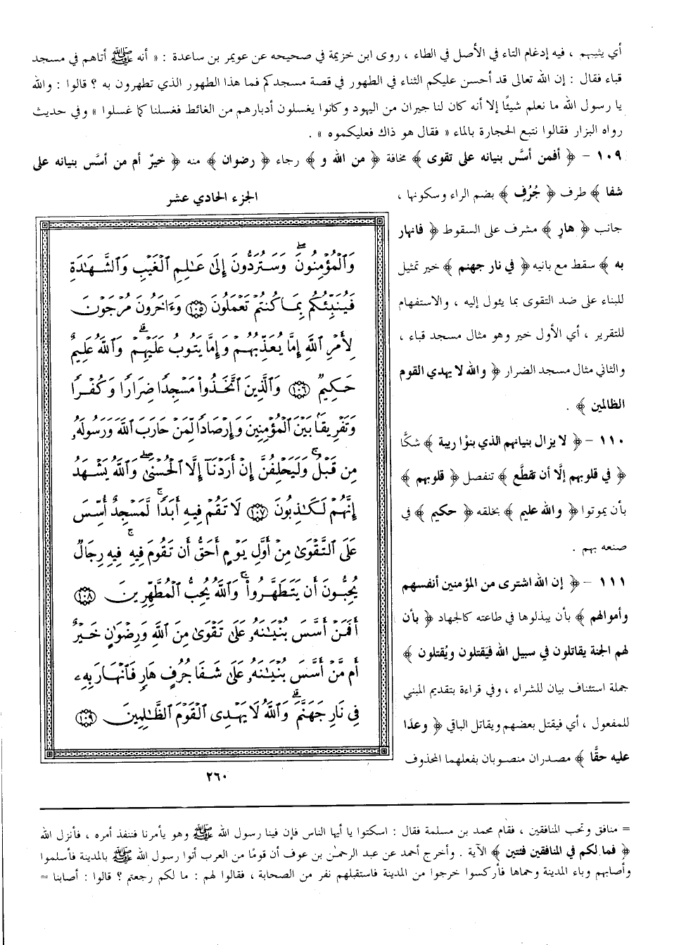 {لَا تَقُمْ} تُصَلِّ {فِيهِ أَبَدًا} فَأَرْسَلَ جَمَاعَة هَدَمُوهُ وَحَرَّقُوهُ وَجَعَلُوا مَكَانه كُنَاسَة تُلْقَى فِيهَا الْجِيَف {لَمَسْجِد أُسِّسَ} بُنِيَتْ قَوَاعِده {عَلَى التَّقْوَى مِنْ أَوَّل يَوْم} وُضِعَ يَوْم حَلَلْت بِدَارِ الْهِجْرَة وَهُوَ مَسْجِد قُبَاءَ كَمَا فِي الْبُخَارِيّ {أَحَقّ} مِنْهُ {أَنْ} أَيْ بِأَنْ {تَقُوم} تُصَلِّي {فِيهِ فِيهِ رِجَال} هُمْ الْأَنْصَار {يُحِبُّونَ أَنْ يَتَطَهَّرُوا وَاَللَّه يُحِبّ الْمُطَّهِّرِينَ} أَيْ يُثِيبهُمْ فِيهِ إدْغَام التَّاء فِي الْأَصْل فِي الطَّاء رَوَى بن خُزَيْمَةَ فِي صَحِيحه عَنْ عُوَيْمِر بْن سَاعِدَة أَنَّهُ صَلَّى اللَّه عَلَيْهِ وَسَلَّمَ أَتَاهُمْ فِي مَسْجِد قُبَاءَ فَقَالَ إنَّ اللَّه تَعَالَى قَدْ أَحْسَنَ عَلَيْكُمْ الثَّنَاء فِي الطَّهُور فِي قِصَّة مَسْجِدكُمْ فَمَا هَذَا الطَّهُور الَّذِي تَطَّهَّرُونَ بِهِ قَالُوا وَاَللَّه يَا رَسُول اللَّه مَا نَعْلَم شَيْئًا إلَّا أَنَّهُ كَانَ لَنَا جِيرَان مِنْ الْيَهُود وَكَانُوا يَغْسِلُونَ أَدْبَارهمْ مِنْ الْغَائِط فَغَسَلْنَا كَمَا غَسَلُوا وَفِي حَدِيث رَوَاهُ الْبَزَّار فَقَالُوا نَتْبَع الْحِجَارَة بِالْمَاءِ فَقَالَ هُوَ ذَاكَ فَعَلَيْكُمُوهُ