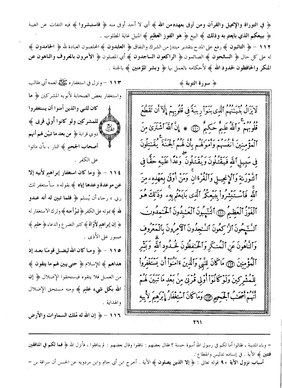 {التَّائِبُونَ} رُفِعَ عَلَى الْمَدْح بِتَقْدِيرِ مُبْتَدَأ مِنْ الشِّرْك وَالنِّفَاق {الْعَابِدُونَ} الْمُخْلِصُونَ الْعِبَادَة لِلَّهِ {الْحَامِدُونَ} لَهُ عَلَى كُلّ حَال {السَّائِحُونَ} الصَّائِمُونَ {الرَّاكِعُونَ السَّاجِدُونَ} أَيْ الْمُصَلُّونَ {الْآمِرُونَ بِالْمَعْرُوفِ وَالنَّاهُونَ عَنْ الْمُنْكَر وَالْحَافِظُونَ لِحُدُودِ اللَّه} لِأَحْكَامِهِ بِالْعَمَلِ بِهَا {وَبَشِّرْ الْمُؤْمِنِينَ} بِالْجَنَّةِ