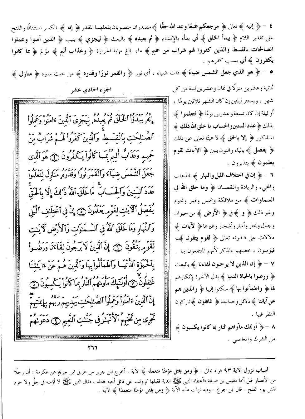 {هُوَ الَّذِي جَعَلَ الشَّمْس ضِيَاء} ذَات ضِيَاء أَيْ نُور {وَالْقَمَر نُورًا وَقَدَّرَهُ} مِنْ حَيْثُ سَيَّرَهُ {مَنَازِل} ثَمَانِيَة وَعِشْرِينَ مَنْزِلًا فِي ثَمَان وَعِشْرِينَ لَيْلَة مِنْ كُلّ شَهْر وَيَسْتَتِر لَيْلَتَيْنِ إنْ كَانَ الشَّهْر ثَلَاثِينَ يَوْمًا أَوْ لَيْلَة إنْ كَانَ تِسْعَة وَعِشْرِينَ يَوْمًا {لِتَعْلَمُوا} بِذَلِكَ {عَدَد السِّنِينَ وَالْحِسَاب مَا خَلَقَ اللَّه ذَلِكَ} الْمَذْكُور {إلَّا بِالْحَقِّ} لَا عَبَثًا تَعَالَى عَنْ ذَلِكَ {يُفَصِّل} بِالْيَاءِ وَالنُّون يُبَيِّن {الْآيَات لِقَوْمٍ يعلمون} يتدبرون