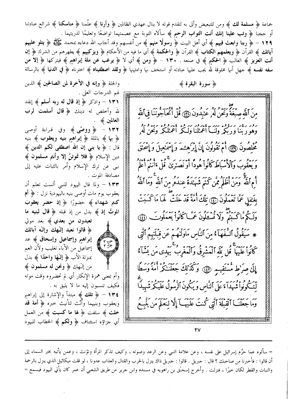 وَلَمَّا قَالَ الْيَهُود لِلنَّبِيِّ أَلَسْت تَعْلَم أَنَّ يَعْقُوب يَوْم مَاتَ أَوْصَى بَنِيهِ بِالْيَهُودِيَّةِ نَزَلَ {أَمْ كُنْتُمْ شُهَدَاء} حُضُورًا {إذْ حَضَرَ يَعْقُوبَ الْمَوْتُ إذْ} بَدَل مِنْ إذْ قَبْله {قَالَ لِبَنِيهِ مَا تَعْبُدُونَ مِنْ بَعْدِي} بَعْد مَوْتِي {قَالُوا نَعْبُد إلَهك وَإِلَه آبَائِك إبْرَاهِيم وَإِسْمَاعِيل وَإِسْحَاق} عَدّ إسْمَاعِيل مِنْ الْآبَاء تَغْلِيب وَلِأَنَّ الْعَمّ بِمَنْزِلَةِ الْأَب {إلَهًا وَاحِدًا} بَدَل مِنْ إلَهك {ونحن له مسلمون} وَأَمْ بِمَعْنَى هَمْزَة الْإِنْكَار أَيْ لَمْ تَحْضُرُوهُ وَقْت مَوْته فَكَيْفَ تَنْسُبُونَ إلَيْهِ مَا لَا يَلِيق بِهِ