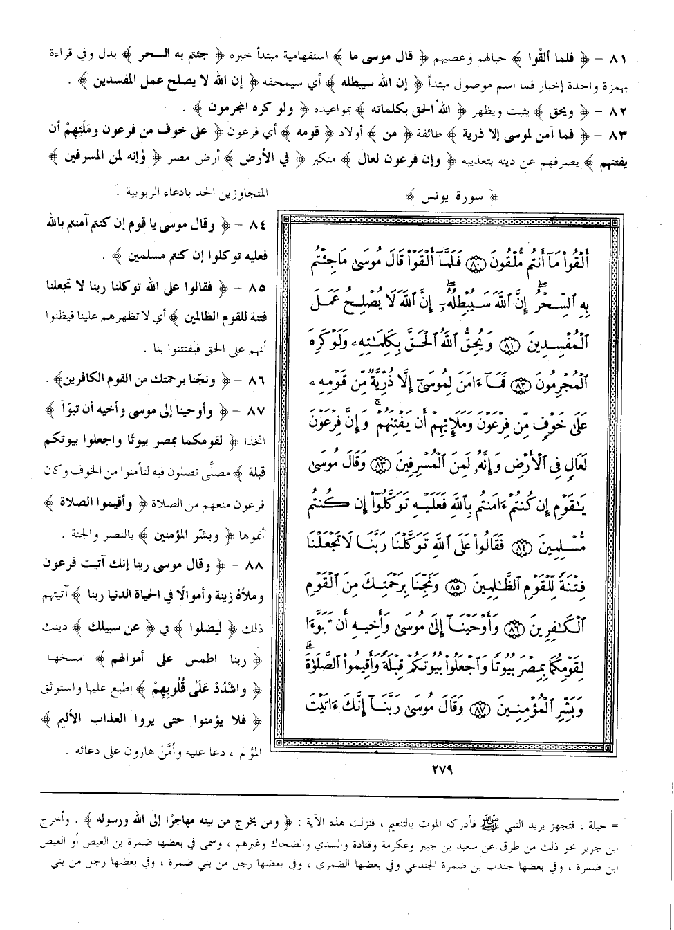 {وَأَوْحَيْنَا إلَى مُوسَى وَأَخِيهِ أَنْ تَبَوَّآ} اتَّخِذَا {لِقَوْمِكُمَا بِمِصْرَ بُيُوتًا وَاجْعَلُوا بُيُوتكُمْ قِبْلَة} مُصَلًّى تُصَلُّونَ فِيهِ لِتَأْمَنُوا مِنْ الْخَوْف وَكَانَ فِرْعَوْن مَنَعَهُمْ مِنْ الصَّلَاة {وَأَقِيمُوا الصَّلَاة} أَتِمُّوهَا {وَبَشِّرْ الْمُؤْمِنِينَ} بِالنَّصْرِ وَالْجَنَّة