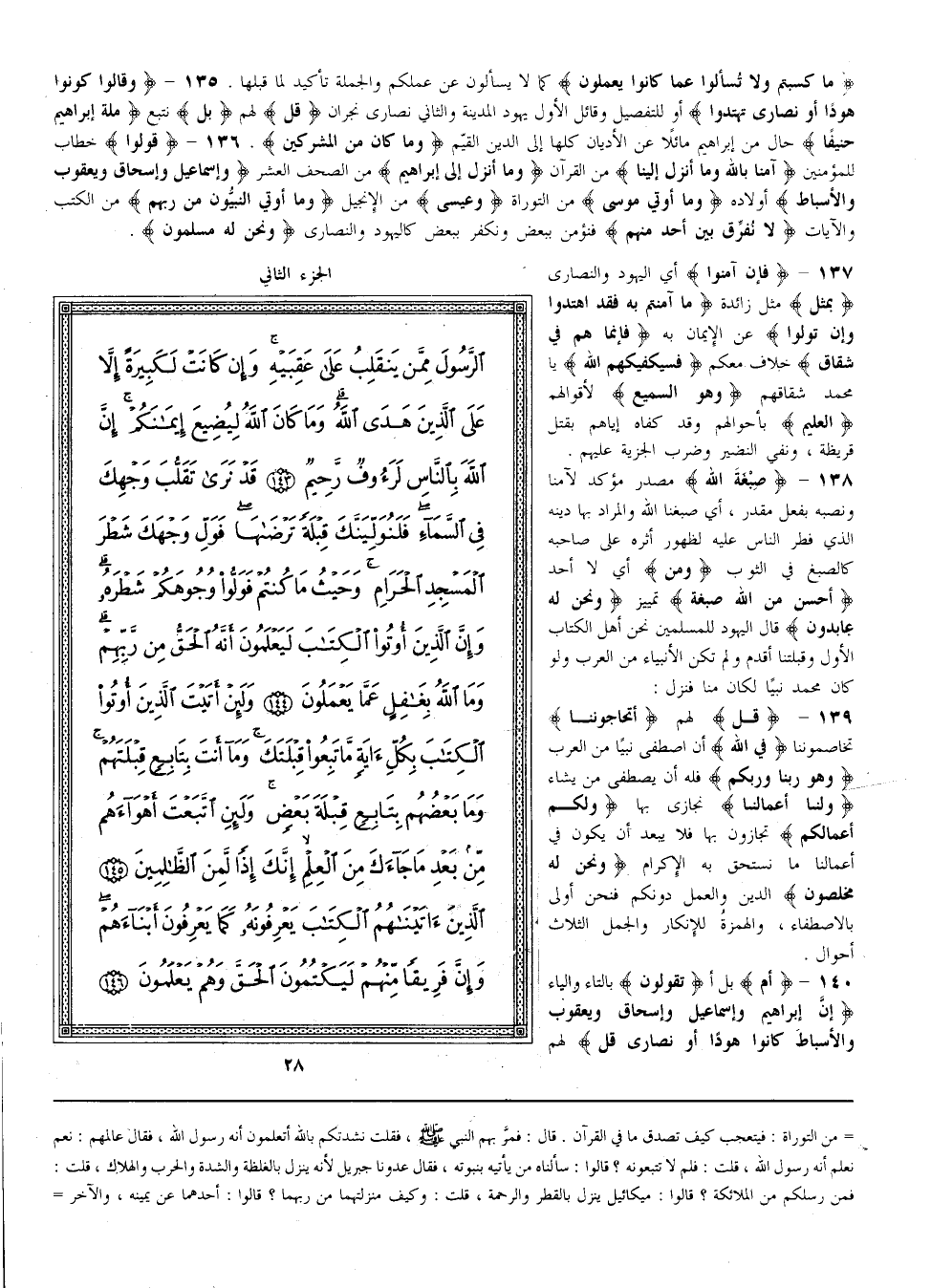 {صِبْغَة اللَّه} مَصْدَر مُؤَكِّد لِآمَنَّا وَنَصْبُهُ بِفِعْلٍ مُقَدَّر أَيْ صَبَغَنَا اللَّه وَالْمُرَاد بِهَا دِينه الَّذِي فَطَرَ النَّاس عَلَيْهِ لِظُهُورِ أَثَره عَلَى صَاحِبه كَالصَّبْغِ فِي الثَّوْب {وَمَنْ} أَيْ لَا أَحَد {أَحْسَن مِنْ اللَّه صِبْغَة} تَمْيِيز {وَنَحْنُ لَهُ عَابِدُونَ} قَالَ الْيَهُود لِلْمُسْلِمِينَ نَحْنُ أَهْل الْكِتَاب الْأَوَّل وَقِبْلَتنَا أَقْدَم وَلَمْ تَكُنْ الْأَنْبِيَاء مِنْ الْعَرَب وَلَوْ كَانَ مُحَمَّد نَبِيًّا لَكَانَ منا فنزل