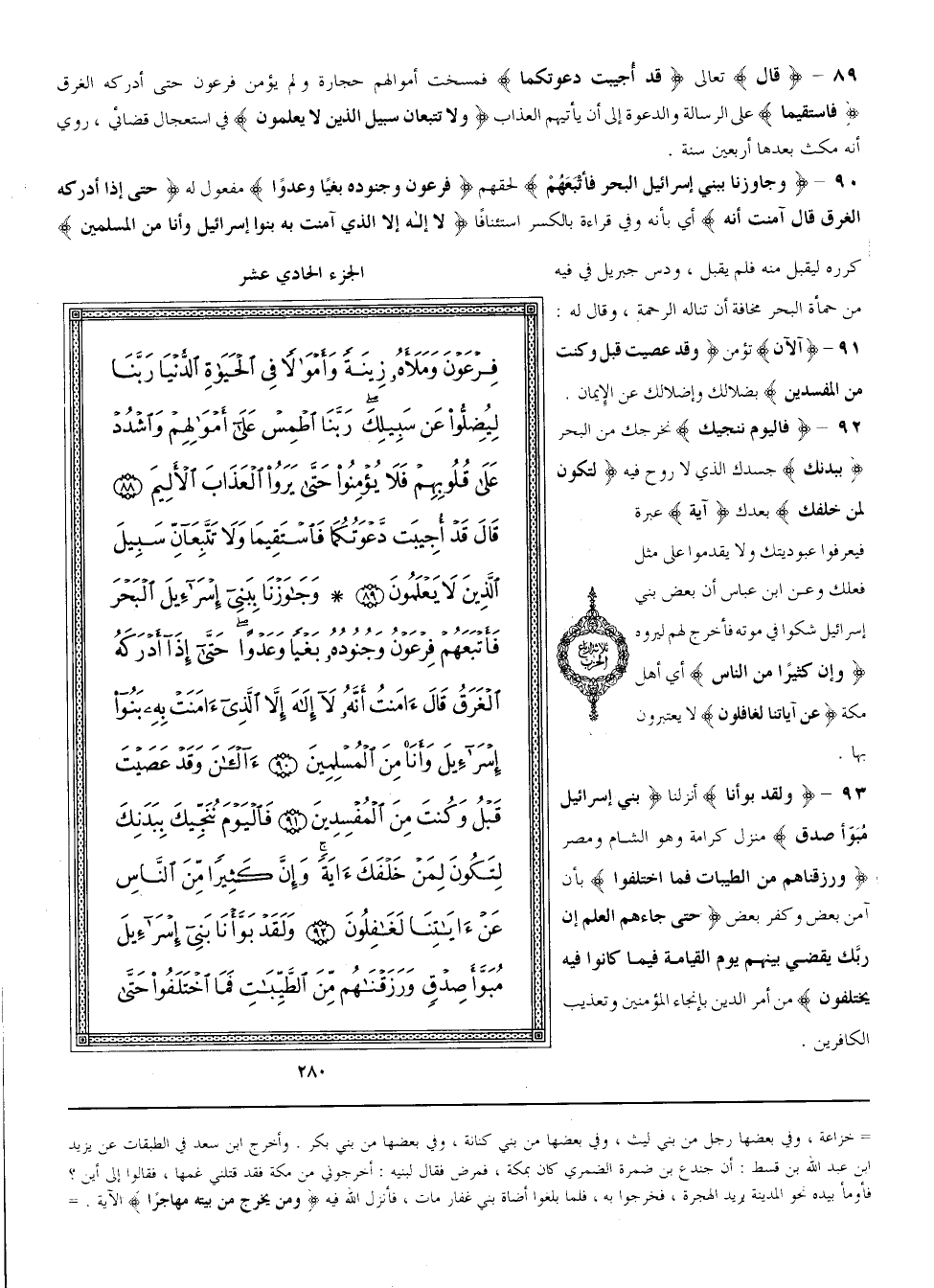 {وَجَاوَزْنَا بِبَنِي إسْرَائِيل الْبَحْر فَأَتْبَعَهُمْ} لَحِقَهُمْ {فِرْعَوْن وَجُنُوده بَغْيًا وَعَدْوًا} مَفْعُول لَهُ {حَتَّى إذَا أَدْرَكَهُ الْغَرَق قَالَ آمَنْت أَنَّهُ} أَيْ بِأَنَّهُ وَفِي قِرَاءَة بِالْكَسْرِ اسْتِئْنَافًا {لَا إلَه إلَّا الذي آمنت به بنوا إسْرَائِيل وَأَنَا مِنْ الْمُسْلِمِينَ} كَرَّرَهُ لِيَقْبَل مِنْهُ فَلَمْ يَقْبَل وَدَسَّ جِبْرِيل فِي فِيهِ مِنْ حَمْأَة الْبَحْر مَخَافَة أَنْ تَنَالهُ الرَّحْمَة وَقَالَ له