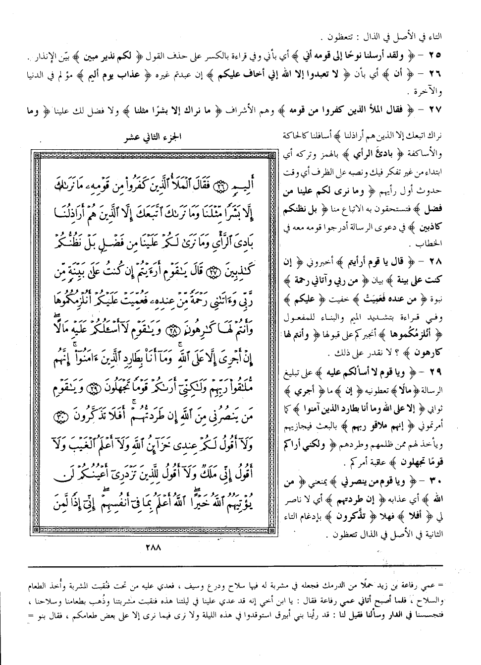 {فَقَالَ الْمَلَأ الَّذِينَ كَفَرُوا مِنْ قَوْمه} وَهُمْ الْأَشْرَاف {مَا نَرَاك إلَّا بَشَرًا مِثْلنَا} وَلَا فَضْل لَك عَلَيْنَا {وَمَا نَرَاك اتَّبَعَك إلَّا الَّذِينَ هُمْ أَرَاذِلنَا} أَسَافِلنَا كَالْحَاكَةِ وَالْأَسَاكِفَة {بَادِئ الرَّأْي} بِالْهَمْزِ وَتَرْكه أَيْ ابْتِدَاء مِنْ غَيْر تَفَكُّر فِيك وَنَصْبه عَلَى الظَّرْف أَيْ وَقْت حُدُوث أَوَّل رَأْيهمْ {وَمَا نَرَى لَكُمْ عَلَيْنَا مِنْ فَضْل} فَتَسْتَحِقُّونَ بِهِ الِاتِّبَاع مِنَّا {بَلْ نَظُنّكُمْ كَاذِبِينَ} فِي دَعْوَى الرِّسَالَة أَدْرَجُوا قَوْمه مَعَهُ فِي الْخِطَاب