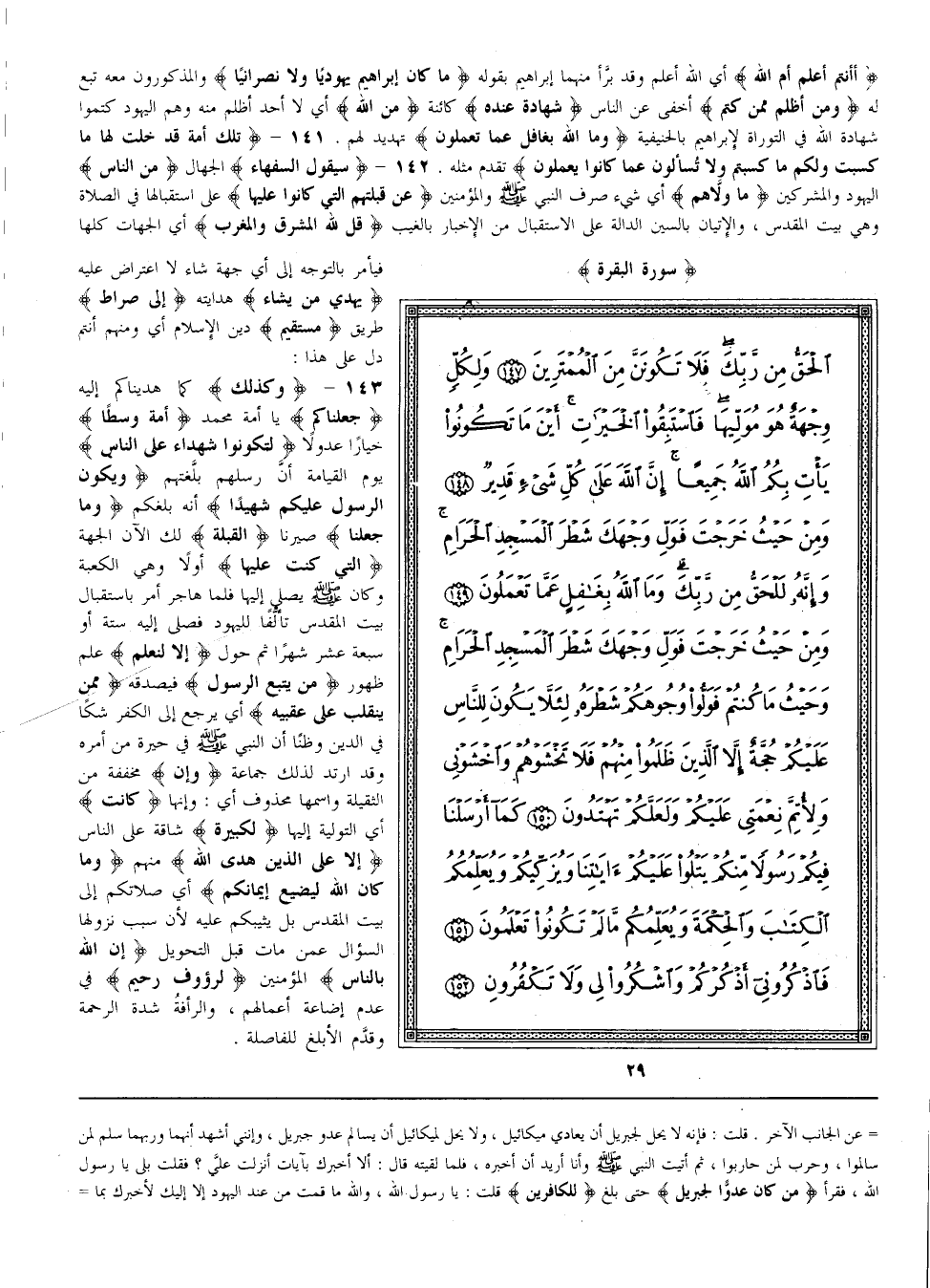 {سيقول السفهاء} الجهال {مِنْ النَّاس} الْيَهُود وَالْمُشْرِكِينَ {مَا وَلَّاهُمْ} أَيّ شَيْء صَرَفَ النَّبِيّ صَلَّى اللَّه عَلَيْهِ وَسَلَّمَ وَالْمُؤْمِنِينَ {عَنْ قِبْلَتهمْ الَّتِي كَانُوا عَلَيْهَا} عَلَى استقبالها في الصلاة وهي بيت المقدس وَالْإِتْيَان بِالسِّينِ الدَّالَّة عَلَى الِاسْتِقْبَال مِنْ الْإِخْبَار بالغيب {قُلْ لِلَّهِ الْمَشْرِق وَالْمَغْرِب} أَيْ الْجِهَات كُلّهَا فَيَأْمُر بِالتَّوَجُّهِ إلَى أَيّ جِهَة شَاءَ لَا اعْتِرَاض عَلَيْهِ {يَهْدِي مَنْ يَشَاء} هِدَايَته {إلَى صِرَاط} طَرِيق {مُسْتَقِيم} دِين الْإِسْلَام أَيْ وَمِنْهُمْ أَنْتُمْ دَلَّ عَلَى هَذَا