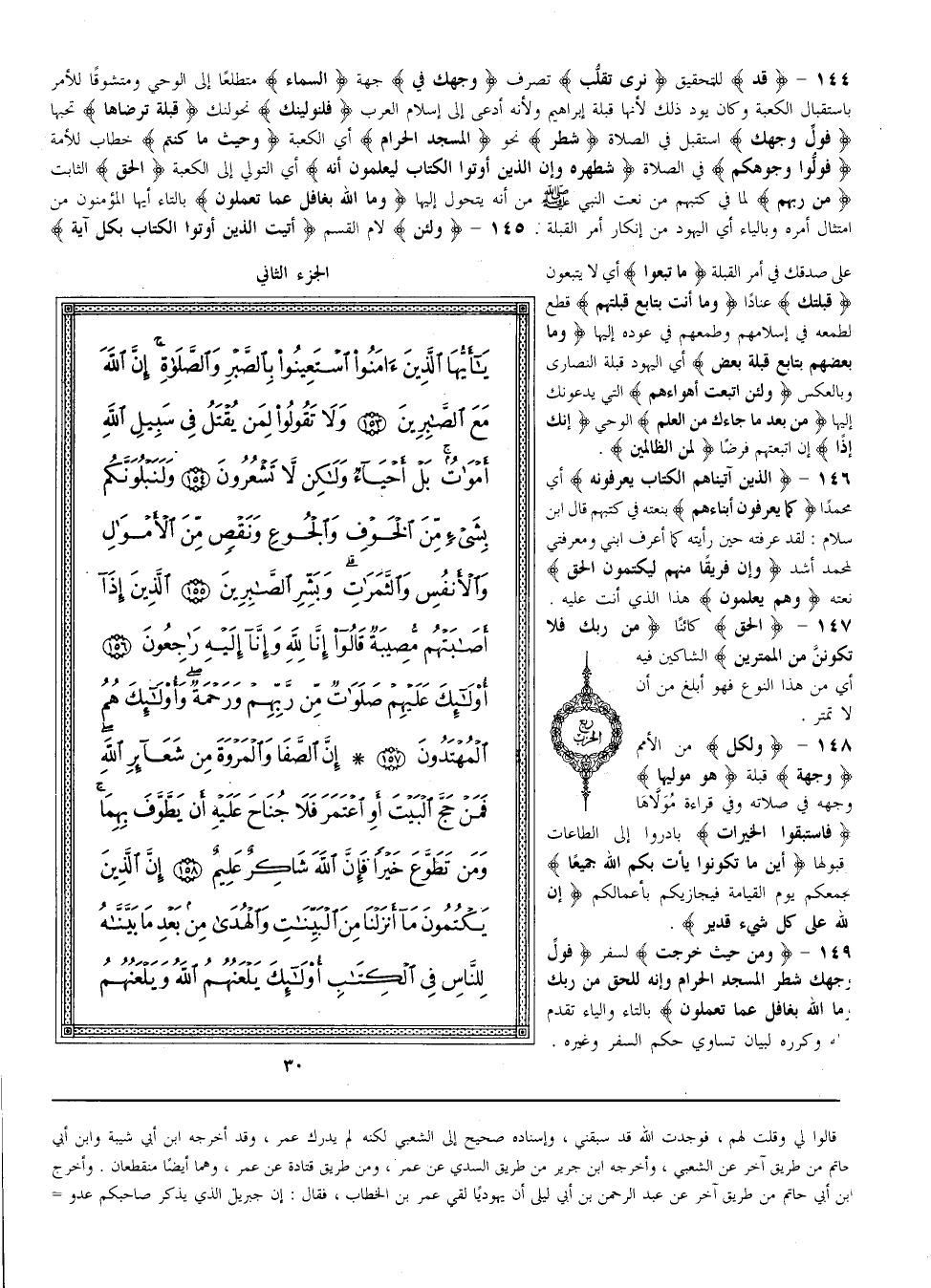 {قَدْ} لِلتَّحْقِيقِ {نَرَى تَقَلُّب} تَصَرُّف {وَجْهك فِي} جِهَة {السَّمَاء} مُتَطَلِّعًا إلَى الْوَحْي وَمُتَشَوِّقًا لِلْأَمْرِ بِاسْتِقْبَالِ الْكَعْبَة وَكَانَ يَوَدّ ذَلِكَ لِأَنَّهَا قِبْلَة إبْرَاهِيم وَلِأَنَّهُ أَدْعَى إلَى إسْلَام الْعَرَب {فَلَنُوَلِّيَنَّكَ} نُحَوِّلَنَّك {قِبْلَة تَرْضَاهَا} تُحِبّهَا {فَوَلِّ وَجْهك} اسْتَقْبِلْ فِي الصَّلَاة {شَطْر} نَحْو {الْمَسْجِد الْحَرَام} أَيْ الْكَعْبَة {وَحَيْثُ مَا كُنْتُمْ} خِطَاب لِلْأُمَّةِ {فَوَلُّوا وُجُوهكُمْ} فِي الصَّلَاة {شَطْره وَإِنَّ الَّذِينَ أُوتُوا الْكِتَاب لَيَعْلَمُونَ أَنَّهُ} أَيْ التَّوَلِّي إلَى الْكَعْبَة {الْحَقّ} الثَّابِت {مِنْ رَبّهمْ} لِمَا فِي كُتُبهمْ مِنْ نَعْت النَّبِيّ صَلَّى اللَّه عَلَيْهِ وَسَلَّمَ مِنْ أَنَّهُ يَتَحَوَّل إلَيْهَا {وَمَا اللَّه بِغَافِلٍ عما تعملون} بِالتَّاءِ أَيّهَا الْمُؤْمِنُونَ مِنْ امْتِثَال أَمْره وَبِالْيَاءِ أَيْ الْيَهُود مِنْ إنْكَار أَمْر الْقِبْلَة