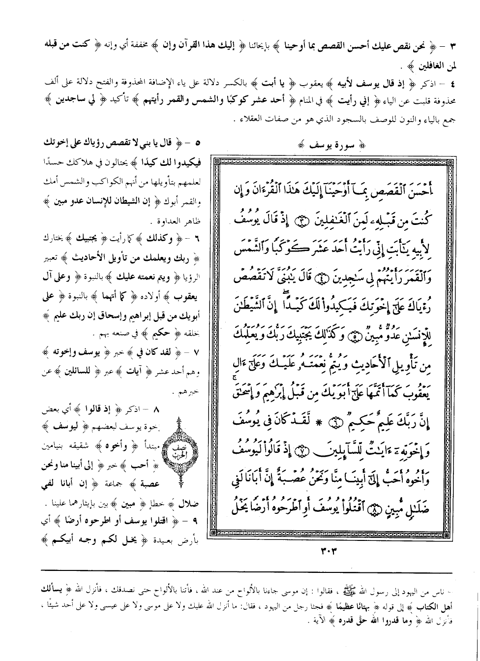 اُذْكُرْ {إذْ قَالَ يُوسُف لِأَبِيهِ} يَعْقُوب {يَا أَبَتِ} بِالْكَسْرِ دَلَالَة عَلَى يَاء الْإِضَافَة الْمَحْذُوفَة وَالْفَتْح دَلَالَة عَلَى أَلِف مَحْذُوفَة قُلِبَتْ عَنْ الْيَاء {إنِّي رَأَيْت} فِي الْمَنَام {أَحَد عَشَر كَوْكَبًا وَالشَّمْس وَالْقَمَر رَأَيْتهمْ} تَأْكِيد {لِي سَاجِدِينَ} جُمِعَ بِالْيَاءِ وَالنُّون لِلْوَصْفِ بِالسُّجُودِ الَّذِي هُوَ مِنْ صِفَات الْعُقَلَاء