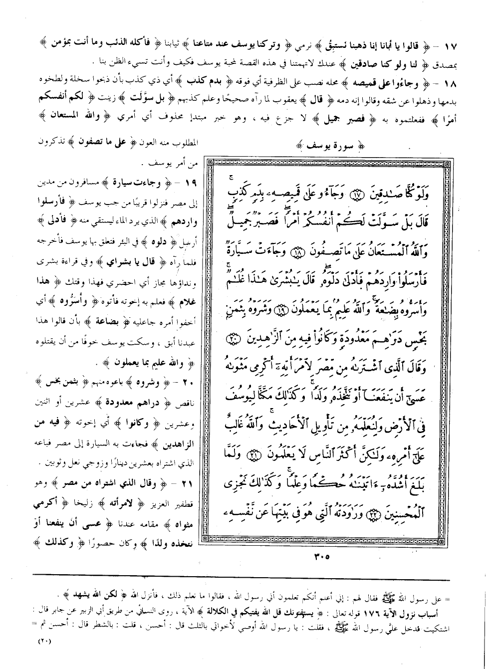 {وَجَاءُوا عَلَى قَمِيصه} مَحَلّه نَصْب عَلَى الظَّرْفِيَّة أَيْ فَوْقه {بِدَمٍ كَذِب} أَيْ ذِي كَذِب بِأَنْ ذَبَحُوا سَخْلَة وَلَطَّخُوهُ بِدَمِهَا وَذُهِلُوا عَنْ شَقّه وَقَالُوا إنَّهُ دَمه {قَالَ} يَعْقُوب لَمَّا رَآهُ صَحِيحًا وَعَلِمَ كَذِبهمْ {بَلْ سَوَّلَتْ} زَيَّنَتْ {لَكُمْ أَنْفُسكُمْ أَمْرًا} فَفَعَلْتُمُوهُ بِهِ {فَصَبْر جَمِيل} لَا جَزَع فِيهِ وَهُوَ خَبَر مُبْتَدَأ مَحْذُوف أَيْ أَمْرِي {وَاَللَّه الْمُسْتَعَان} الْمَطْلُوب مِنْهُ الْعَوْن {عَلَى مَا تَصِفُونَ} تَذْكُرُونَ مِنْ أَمْر يُوسُف