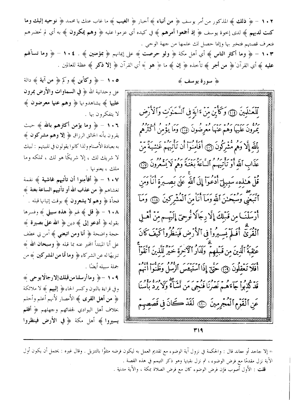 {وَكَأَيِّنْ} وَكَمْ {مِنْ آيَة} دَالَّة عَلَى وَحْدَانِيَّة الله {في السماوات وَالْأَرْض يَمُرُّونَ عَلَيْهَا} يُشَاهِدُونَهَا {وَهُمْ عَنْهَا مُعْرِضُونَ} لَا يَتَفَكَّرُونَ بِهَا