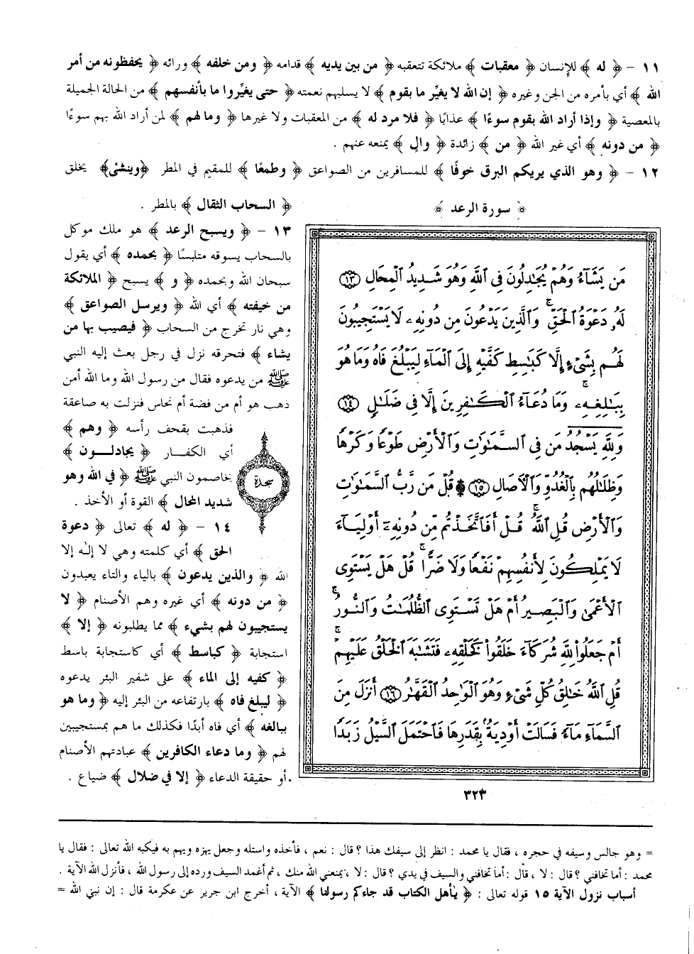 {وَيُسَبِّح الرَّعْد} هُوَ مَلَك مُوَكَّل بِالسَّحَابِ يَسُوقهُ مُتَلَبِّسًا {بِحَمْدِهِ} أَيْ يَقُول سُبْحَان اللَّه وَبِحَمْدِهِ {و} يُسَبِّح {الْمَلَائِكَة مِنْ خِيفَته} أَيْ اللَّه {وَيُرْسِل الصَّوَاعِق} وَهِيَ نَار تَخْرُج مِنْ السَّحَاب {فَيُصِيب بِهَا مَنْ يَشَاء} فَتُحْرِقهُ نَزَلَ فِي رَجُل بَعَثَ إلَيْهِ النَّبِيّ صَلَّى اللَّه عَلَيْهِ وَسَلَّمَ مَنْ يَدْعُوهُ فَقَالَ مَنْ رَسُولُ اللَّه وَمَا اللَّه أَمِنْ ذَهَب هُوَ أَمْ مِنْ فِضَّة أَمْ نُحَاس فَنَزَلَتْ بِهِ صَاعِقَة فَذَهَبَتْ بِقِحْفِ رَأْسه {وَهُمْ} أَيْ الْكُفَّار {يُجَادِلُونَ} يُخَاصِمُونَ النَّبِيّ صَلَّى اللَّه عَلَيْهِ وَسَلَّمَ {فِي اللَّه وَهُوَ شَدِيد الْمَحَال} الْقُوَّة أَوْ الْأَخَذ