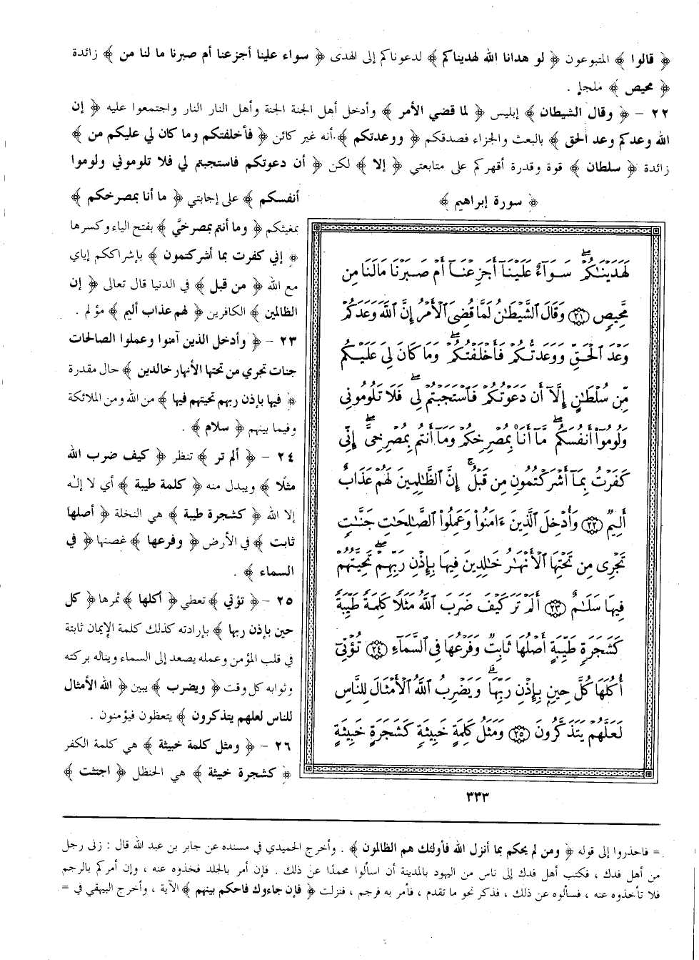 {وَقَالَ الشَّيْطَان} إبْلِيس {لَمَّا قُضِيَ الْأَمْر} وَأُدْخِلَ أَهْل الْجَنَّة الْجَنَّة وَأَهْل النَّار النَّار وَاجْتَمَعُوا عَلَيْهِ {إنَّ اللَّه وَعَدَكُمْ وَعْد الْحَقّ} بِالْبَعْثِ وَالْجَزَاء فَصَدَقَكُمْ {وَوَعَدْتُكُمْ} أَنَّهُ غَيْر كَائِن {فَأَخْلَفْتُكُمْ وَمَا كَانَ لِي عَلَيْكُمْ مِنْ} زَائِدَة {سُلْطَان} قُوَّة وَقُدْرَة أَقْهَركُمْ عَلَى مُتَابَعَتِي {إلَّا} لَكِنْ {أَنْ دَعَوْتُكُمْ فَاسْتَجَبْتُمْ لِي فَلَا تَلُومُونِي وَلُومُوا أَنْفُسكُمْ} عَلَى إجَابَتِي {مَا أَنَا بِمُصْرِخِكُمْ} بِمُغِيثِكُمْ {وَمَا أَنْتُمْ بِمُصْرِخِيَّ} بِفَتْحِ الْيَاء وَكَسْرهَا {إنِّي كفرت بما أشركتمون} بِإِشْرَاكِكُمْ إيَّايَ مَعَ اللَّه {مِنْ قَبْل} فِي الدنيا قال تعالى {إنَّ الظَّالِمِينَ} الْكَافِرِينَ {لَهُمْ عَذَاب أَلِيم} مُؤْلِم