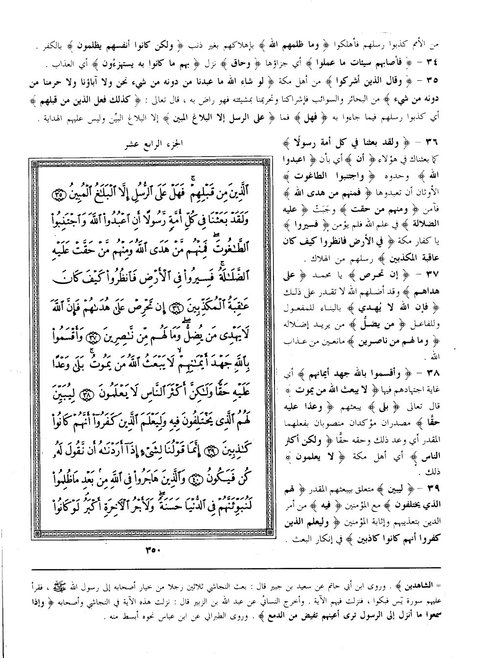 {وَلَقَدْ بَعَثْنَا فِي كُلّ أُمَّة رَسُولًا} كَمَا بَعَثْنَاك فِي هَؤُلَاءِ {أَنْ} أَيْ بِأَنْ {اُعْبُدُوا اللَّه} وَحِّدُوهُ {وَاجْتَنِبُوا الطَّاغُوت} الْأَوْثَان أَنْ تَعْبُدُوهَا {فَمِنْهُمْ مَنْ هَدَى اللَّه} فَآمَنَ {وَمِنْهُمْ مَنْ حَقَّتْ} وَجَبَتْ {عَلَيْهِ الضَّلَالَة} فِي عِلْم اللَّه فَلَمْ يُؤْمِن {فَسِيرُوا} يَا كُفَّار مَكَّة {فِي الْأَرْض فَانْظُرُوا كَيْفَ كَانَ عَاقِبَة الْمُكَذِّبِينَ} رُسُلهمْ من الهلاك