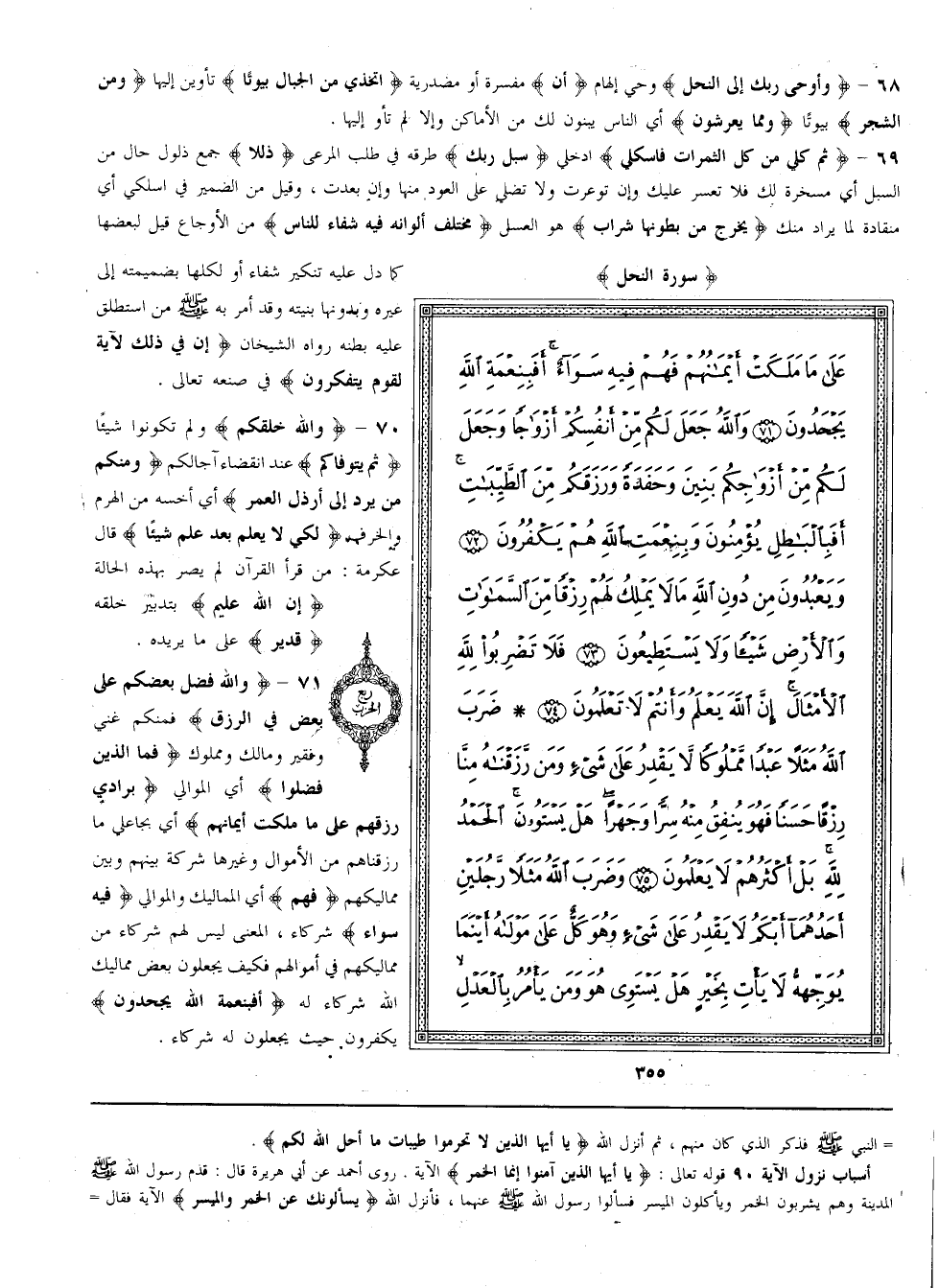 {ثم كلي من كل الثَّمَرَات فَاسْلُكِي اُدْخُلِي سُبُل رَبّك طُرُقه فِي طَلَب الْمَرْعَى ذُلُلًا جَمْع ذَلُول حَال مِنْ السُّبُل أَيْ مُسَخَّرَة لَك فَلَا تَعْسُر عَلَيْك وَإِنْ تَوَعَّرَتْ وَلَا تَضِلِّي عَلَى الْعَوْد مِنْهَا وَإِنْ بَعُدَتْ وَقِيلَ مِنْ الضَّمِير فِي اُسْلُكِي أَيْ مُنْقَادَة لِمَا يُرَادُ مِنْك يَخْرُج مِنْ بُطُونهَا شَرَاب هُوَ الْعَسَل مُخْتَلِف أَلْوَانه فِيهِ شِفَاء لِلنَّاسِ مِنْ الْأَوْجَاع قِيلَ لِبَعْضِهَا كَمَا دَلَّ عَلَيْهِ تَنْكِير شِفَاء أَوْ لِكُلِّهَا بِضَمِيمَتِهِ إلى غيره أقول وَبِدُونِهَا بِنِيَّتِهِ وَقَدْ أَمَرَ بِهِ صَلَّى اللَّه عَلَيْهِ وَسَلَّمَ مَنْ اسْتَطْلَقَ عَلَيْهِ بَطْنه رَوَاهُ الشَّيْخَانِ إنَّ فِي ذَلِكَ لَآيَة لِقَوْمٍ يَتَفَكَّرُونَ في صنعه تعالى}