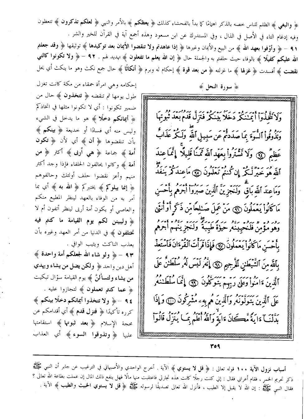 {وَلَا تَكُونُوا كَاَلَّتِي نَقَضَتْ} أَفْسَدَتْ {غَزْلهَا} مَا غَزَلَتْهُ {مِنْ بَعْد قُوَّة} إحْكَام لَهُ وَبَرْم {أَنْكَاثًا} حَال جَمْع نَكْث وَهُوَ مَا يُنْكَث أَيْ يُحَلّ إحْكَامه وَهِيَ امْرَأَة حَمْقَاء مِنْ مَكَّة كَانَتْ تَغْزِل طُول يَوْمهَا ثُمَّ تَنْقُضهُ {تَتَّخِذُونَ} حَال مِنْ ضَمِير تَكُونُوا أَيْ لَا تَكُونُوا مِثْلهَا فِي اتِّخَاذكُمْ {أَيْمَانكُمْ دَخَلًا} هُوَ مَا يَدْخُل فِي الشَّيْء وَلَيْسَ مِنْهُ أَيْ فَسَادًا أَوْ خَدِيعَة {بَيْنكُمْ} بِأَنْ تَنْقُضُوهَا {أَنْ} أَيْ لِأَنْ {تَكُون أُمَّة} جَمَاعَة {هِيَ أَرْبَى} أَكْثَر {مِنْ أُمَّة} وَكَانُوا يُحَالِفُونَ الْحُلَفَاء فَإِذَا وُجِدَ أَكْثَر مِنْهُمْ وَأَعَزّ نَقَضُوا حِلْف أُولَئِكَ وَحَالَفُوهُمْ {إنَّمَا يَبْلُوكُمْ} يَخْتَبِركُمْ {اللَّه بِهِ} أَيْ بِمَا أَمَرَ بِهِ مِنْ الْوَفَاء بِالْعَهْدِ لِيَنْظُر الْمُطِيع مِنْكُمْ وَالْعَاصِيَ أَوْ يَكُون أُمَّة أَرْبَى لِيَنْظُر أَتَفُونَ أَمْ لَا {وَلَيُبَيِّنَنَّ لَكُمْ يَوْم الْقِيَامَة مَا كُنْتُمْ فِيهِ تَخْتَلِفُونَ} فِي الدُّنْيَا مِنْ أَمْر الْعَهْد وَغَيْره بِأَنْ يُعَذِّب النَّاكِث ويثيب الوافي