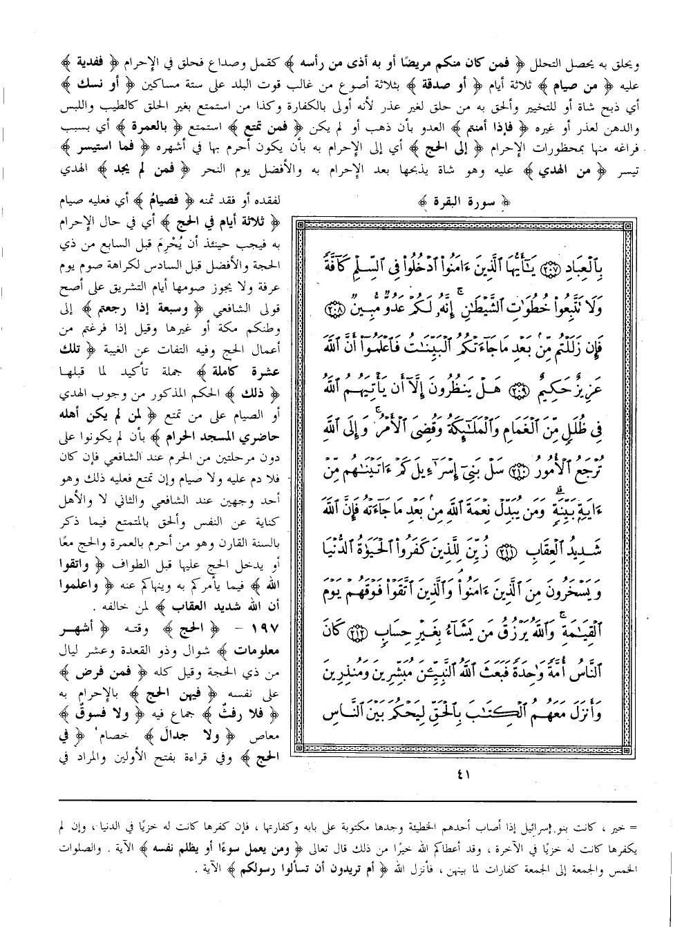 {وَأَتِمُّوا الْحَجّ وَالْعُمْرَة لِلَّهِ} أَدُّوهُمَا بِحُقُوقِهِمَا {فَإِنْ أُحْصِرْتُمْ} مُنِعْتُمْ عَنْ إتْمَامهَا بِعَدُوٍّ {فَمَا اسْتَيْسَرَ} تَيَسَّرَ {مِنْ الْهَدْي} عَلَيْكُمْ وَهُوَ شَاة {وَلَا تحلقوا رؤوسكم} أَيْ لَا تَتَحَلَّلُوا {حَتَّى يَبْلُغ الْهَدْي} الْمَذْكُور {مَحِلّه} حَيْثُ يَحِلّ ذَبْحه وَهُوَ مَكَان الْإِحْصَار عِنْد الشَّافِعِيّ فَيَذْبَح فِيهِ بِنِيَّةِ التَّحَلُّل وَيُفَرِّق على مساكينه ويحلق به يَحْصُل التَّحَلُّل {فَمَنْ كَانَ مِنْكُمْ مَرِيضًا أَوْ بِهِ أَذًى مِنْ رَأْسه} كَقَمْلٍ وَصُدَاع فَحَلَقَ فِي الْإِحْرَام {فَفِدْيَة} عَلَيْهِ {مِنْ صِيَام} ثَلَاثَة أَيَّام {أَوْ صَدَقَة} بِثَلَاثَةِ أَصْوُع مِنْ غَالِب قُوت الْبَلَد عَلَى سِتَّة مَسَاكِين {أَوْ نُسُك} أي ذبح شاة أو لِلتَّخْيِيرِ وَأُلْحِقَ بِهِ مَنْ حَلَقَ لِغَيْرِ عُذْر لِأَنَّهُ أَوْلَى بِالْكَفَّارَةِ وَكَذَا مَنْ اسْتَمْتَعَ بِغَيْرِ الْحَلْق كَالطِّيبِ وَاللُّبْس وَالدَّهْن لِعُذْرٍ أَوْ غَيْره {فَإِذَا أَمِنْتُمْ} الْعَدُوّ بِأَنْ ذَهَبَ أَوْ لَمْ يَكُنْ {فَمَنْ تَمَتَّعَ} اسْتَمْتَعَ {بِالْعُمْرَةِ} أَيْ بِسَبَبِ فَرَاغه مِنْهَا بِمَحْظُورَاتِ الْإِحْرَام {إلَى الْحَجّ}