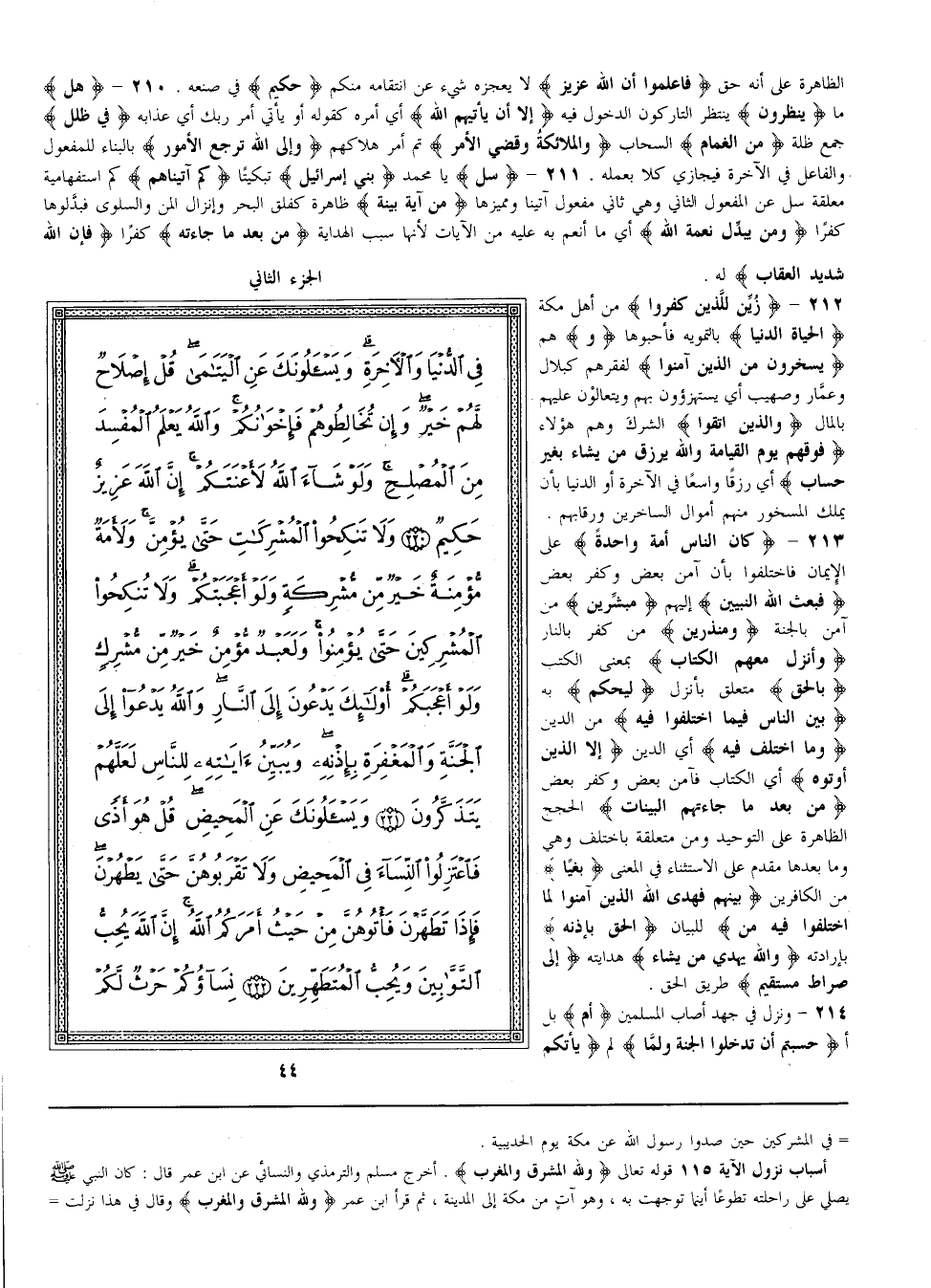 {كَانَ النَّاس أُمَّة وَاحِدَة} عَلَى الْإِيمَان فَاخْتَلَفُوا بِأَنْ آمَنَ بَعْض وَكَفَرَ بَعْض {فَبَعَثَ اللَّه النَّبِيِّينَ} إلَيْهِمْ {مُبَشِّرِينَ} مَنْ آمَنَ بِالْجَنَّةِ {وَمُنْذِرِينَ} مَنْ كَفَرَ بِالنَّارِ {وَأَنْزَلَ مَعَهُمْ الْكِتَاب} بِمَعْنَى الْكُتُب {بِالْحَقِّ} مُتَعَلِّق بِأَنْزَل {لِيَحْكُم} بِهِ {بَيْن النَّاس فِيمَا اخْتَلَفُوا فِيهِ} مِنْ الدِّين {وَمَا اخْتَلَفَ فِيهِ} أَيْ الدِّين {إلَّا الَّذِينَ أُوتُوهُ} أَيْ الْكِتَاب فَآمَنَ بَعْض وَكَفَرَ بَعْض {مِنْ بَعْد مَا جَاءَتْهُمْ الْبَيِّنَات} الْحُجَج الظَّاهِرَة عَلَى التَّوْحِيد وَمِنْ مُتَعَلِّقَة بِاخْتَلَفَ وَهِيَ وَمَا بَعْدهَا مُقَدَّم عَلَى الِاسْتِثْنَاء فِي الْمَعْنَى {بَغْيًا} مِنْ الْكَافِرِينَ {بَيْنهمْ فَهَدَى اللَّه الَّذِينَ آمَنُوا لِمَا اخْتَلَفُوا فِيهِ مِنْ} لِلْبَيَانِ {الْحَقّ بِإِذْنِهِ} بِإِرَادَتِهِ {وَاَللَّه يَهْدِي مَنْ يَشَاء} هِدَايَته {إلَى صِرَاط مُسْتَقِيم} طَرِيق الْحَقّ