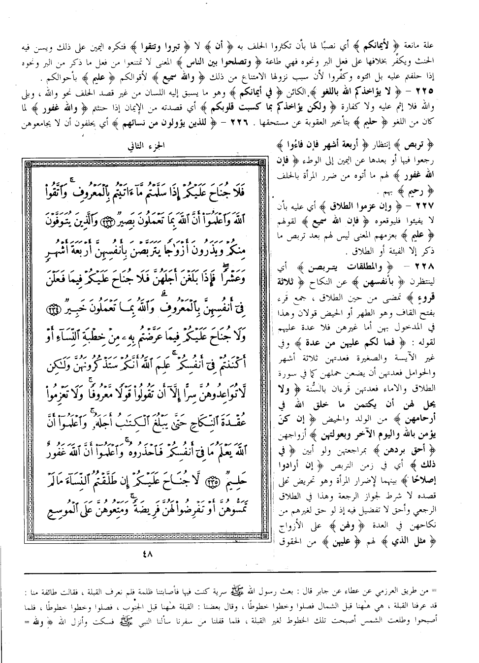 {وَلَا تَجْعَلُوا اللَّه} أَيْ الْحَلِف بِهِ {عُرْضَة} عِلَّة مَانِعَة {لِأَيْمَانِكُمْ} أَيْ نَصْبًا لَهَا بِأَنْ تُكْثِرُوا الْحَلِف بِهِ {أَنْ} لَا {تَبَرُّوا وَتَتَّقُوا} فَتُكْرَه الْيَمِين عَلَى ذَلِكَ وَيُسَنّ فِيهِ الْحِنْث وَيُكَفِّر بِخِلَافِهَا عَلَى فِعْل الْبِرّ وَنَحْوه فَهِيَ طَاعَة {وَتُصْلِحُوا بَيْن النَّاس} الْمَعْنَى لَا تَمْتَنِعُوا مِنْ فِعْل مَا ذُكِرَ مِنْ الْبِرّ وَنَحْوه إذَا حَلَفْتُمْ عَلَيْهِ بَلْ ائْتُوهُ وَكَفَّرُوا لِأَنَّ سَبَب نُزُولهَا الِامْتِنَاع مِنْ ذَلِكَ {وَاَللَّه سَمِيع} لِأَقْوَالِكُمْ {عَلِيم} بِأَحْوَالِكُمْ