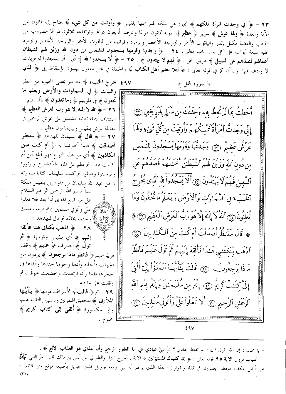 {إنِّي وَجَدْت امْرَأَة تَمْلِكهُمْ} أَيْ هِيَ مَلِكَة لَهُمْ اسْمهَا بِلْقِيس {وَأُوتِيَتْ مِنْ كُلّ شَيْء} يَحْتَاج إلَيْهِ الْمُلُوك مِنْ الْآلَة وَالْعُدَّة {وَلَهَا عَرْش} سَرِير {عَظِيم} طُوله ثَمَانُونَ ذِرَاعًا وَعَرْضه أَرْبَعُونَ ذِرَاعًا وَارْتِفَاعه ثَلَاثُونَ ذِرَاعًا مَضْرُوب مِنْ الذَّهَب وَالْفِضَّة مُكَلَّل بِالدُّرِّ وَالْيَاقُوت الْأَحْمَر وَالزَّبَرْجَد الْأَخْضَر وَالزُّمُرُّد وَقَوَائِمه مِنْ الْيَاقُوت الْأَحْمَر وَالزَّبَرْجَد الْأَخْضَر وَالزُّمُرُّد عَلَيْهِ سَبْعَة أَبْوَاب عَلَى كُلّ بَيْت بَاب مُغْلَق