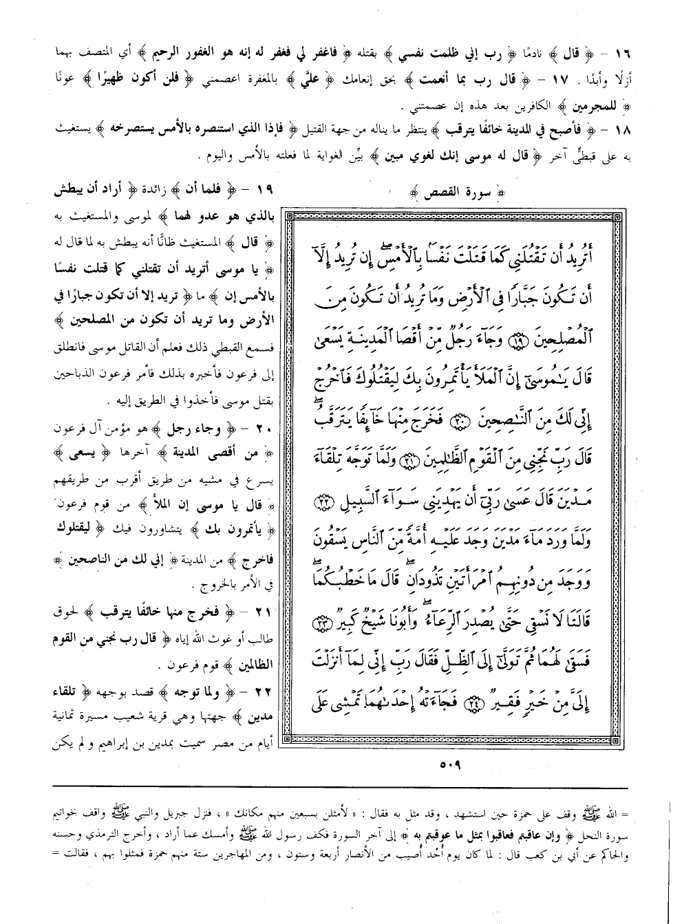 {وَجَاءَ رَجُل} هُوَ مُؤْمِن آل فِرْعَوْن {مِنْ أَقْصَى الْمَدِينَة} آخِرهَا {يَسْعَى} يُسْرِع فِي مَشْيه مِنْ طَرِيق أَقْرَب مِنْ طَرِيقهمْ {قَالَ يَا مُوسَى إنَّ الْمَلَأ} مِنْ قَوْم فِرْعَوْن {يَأْتَمِرُونَ بِك} يَتَشَاوَرُونَ فِيك {لِيَقْتُلُوك فَاخْرُجْ} مِنْ الْمَدِينَة {إنِّي لَك مِنْ النَّاصِحِينَ} فِي الْأَمْر بِالْخُرُوجِ