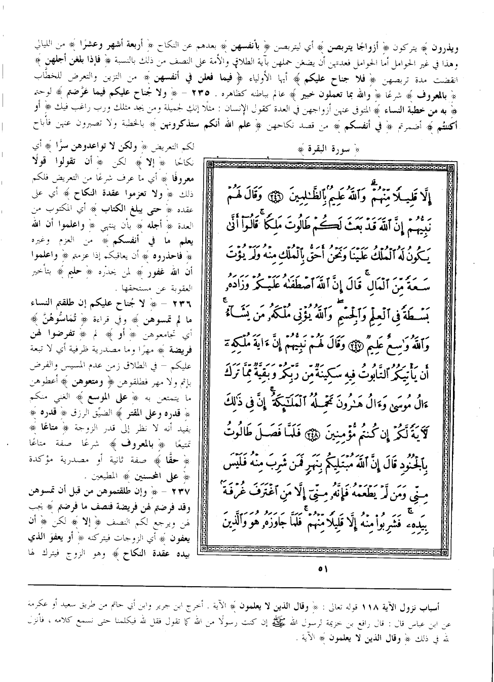 {وَلَا جُنَاح عَلَيْكُمْ فِيمَا عَرَّضْتُمْ} لَوَّحْتُمْ {بِهِ مِنْ خِطْبَة النِّسَاء} الْمُتَوَفَّى عَنْهُنَّ أَزْوَاجهنَّ فِي الْعِدَّة كَقَوْلِ الْإِنْسَان مَثَلًا إنَّك لَجَمِيلَة وَمَنْ يَجِد مِثْلك وَرُبّ رَاغِب فِيك {أَوْ أَكْنَنْتُمْ} أَضْمَرْتُمْ {فِي أَنْفُسكُمْ} مِنْ قَصْد نِكَاحهنَّ {عَلِمَ اللَّه أَنَّكُمْ سَتَذْكُرُونَهُنَّ} بِالْخِطْبَةِ وَلَا تَصْبِرُونَ عَنْهُنَّ فَأَبَاحَ لَكُمْ التَّعْرِيض {وَلَكِنْ لَا تُوَاعِدُوهُنَّ سِرًّا} أَيْ نِكَاحًا {إلَّا} لَكِنْ {أَنْ تَقُولُوا قَوْلًا مَعْرُوفًا} أَيْ مَا عُرِفَ شَرْعًا مِنْ التَّعْرِيض فَلَكُمْ ذَلِكَ {وَلَا تَعْزِمُوا عُقْدَة النِّكَاح} أَيْ عَلَى عَقْده {حَتَّى يَبْلُغ الْكِتَاب} أَيْ الْمَكْتُوب مِنْ الْعِدَّة {أَجَله} بِأَنْ يَنْتَهِي {وَاعْلَمُوا أَنَّ اللَّه يَعْلَم مَا فِي أَنْفُسكُمْ} مِنْ الْعَزْم وَغَيْره {فَاحْذَرُوهُ} أَنْ يُعَاقِبكُمْ إذَا عَزَمْتُمْ {وَاعْلَمُوا أَنَّ اللَّه غَفُور} لِمَنْ يَحْذَرهُ {حَلِيم} بِتَأْخِيرِ الْعُقُوبَة عَنْ مُسْتَحِقّهَا
