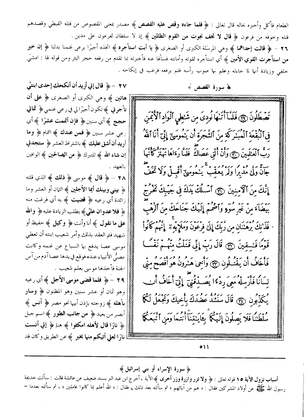 {فَجَاءَتْهُ إحْدَاهُمَا تَمْشِي عَلَى اسْتِحْيَاء} أَيْ وَاضِعَة كُمّ دِرْعهَا عَلَى وَجْههَا حَيَاء مِنْهُ {قَالَتْ إنَّ أَبِي يَدْعُوك لِيَجْزِيَك أَجْر مَا سَقَيْت لَنَا} فَأَجَابَهَا مُنْكِرًا فِي نَفْسه أَخْذ الْأُجْرَة كَأَنَّهَا قَصَدَتْ الْمُكَافَأَة إنْ كَانَ مِمَّنْ يُرِيدهَا فَمَشَتْ بَيْن يَدَيْهِ فَجَعَلَتْ الرِّيح تَضْرِب ثَوْبهَا فَتَكْشِف سَاقَيْهَا فَقَالَ لَهَا امْشِي خَلْفِي وَدُلِّينِي عَلَى الطَّرِيق فَفَعَلَتْ إلَى أَنْ جَاءَ أَبَاهَا وَهُوَ شُعَيْب عَلَيْهِ السَّلَام وَعِنْده عَشَاء فَقَالَ اجلس فتعش قال أَخَاف أَنْ يَكُون عِوَضًا مِمَّا سَقَيْت لَهُمَا وَإِنَّا أَهْل بَيْت لَا نَطْلُب عَلَى عَمَل خَيْر عِوَضًا قَالَ لَا عَادَتِي وَعَادَة آبَائِي نُقْرِي الضَّيْف وَنُطْعِم الطَّعَام فَأَكَلَ وَأَخْبَرَهُ بِحَالِهِ قال تعالى {فَلَمَّا جَاءَهُ وَقَصَّ عَلَيْهِ الْقَصَص} مَصْدَر بِمَعْنَى الْمَقْصُوص مِنْ قِتْله الْقِبْطِيّ وَقَصْدهمْ قَتْله وَخَوْفه مِنْ فِرْعَوْن {قَالَ لَا تَخَفْ نَجَوْت مِنْ الْقَوْم الظَّالِمِينَ} إذْ لَا سُلْطَان لِفِرْعَوْن عَلَى مدين