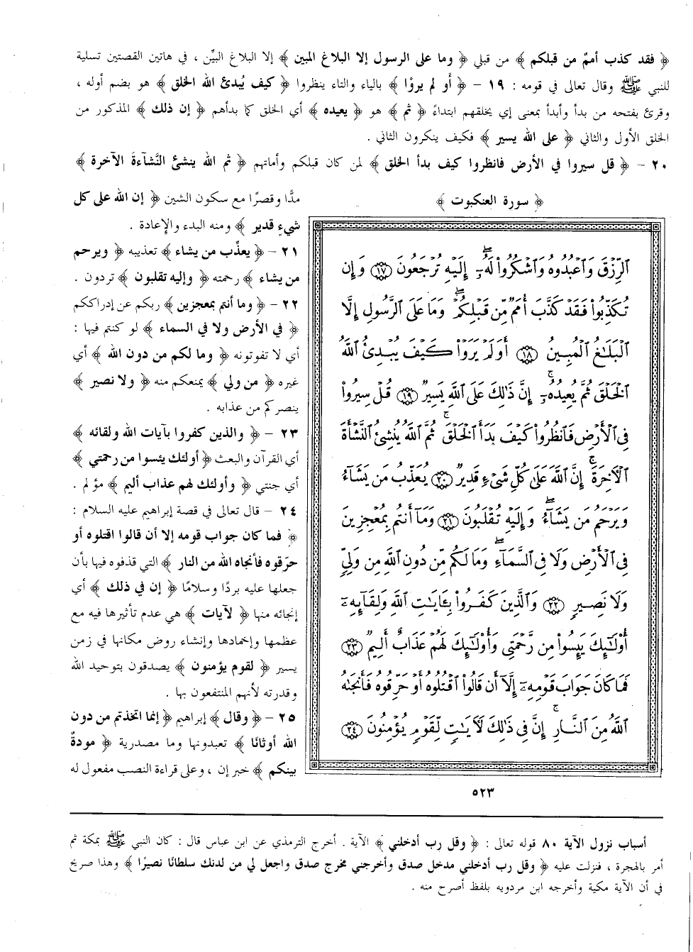{قُلْ سِيرُوا فِي الْأَرْض فَانْظُرُوا كَيْفَ بَدَأَ الْخَلْق} لِمَنْ كَانَ قَبْلكُمْ وَأَمَاتَهُمْ {ثُمَّ اللَّه ينشئ النشآءة الْآخِرَة} مَدًّا وَقَصْرًا مَعَ سُكُون الشِّين {إنَّ اللَّه عَلَى كُلّ شَيْء قَدِير} وَمِنْهُ الْبَدْء والإعادة