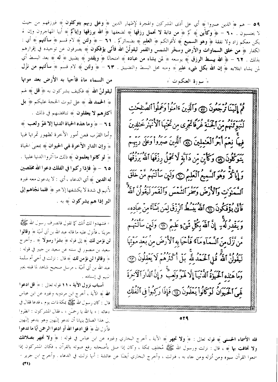 {وَاَلَّذِينَ آمَنُوا وَعَمِلُوا الصَّالِحَات لَنُبَوِّئَنَّهُمْ} نُنْزِلَنَّهُمْ وَفِي قِرَاءَة بِالْمُثَلَّثَةِ بَعْد النُّون مِنْ الثَّوَاء الْإِقَامَة وَتَعْدِيَته إلَى غُرَفًا بِحَذْفِ فِي {مِنْ الْجَنَّة غُرَفًا تَجْرِي مِنْ تَحْتهَا الْأَنْهَار خَالِدِينَ} مُقَدَّرِينَ الْخُلُود {فِيهَا نِعْمَ أَجْر الْعَامِلِينَ} هَذَا الْأَجْر