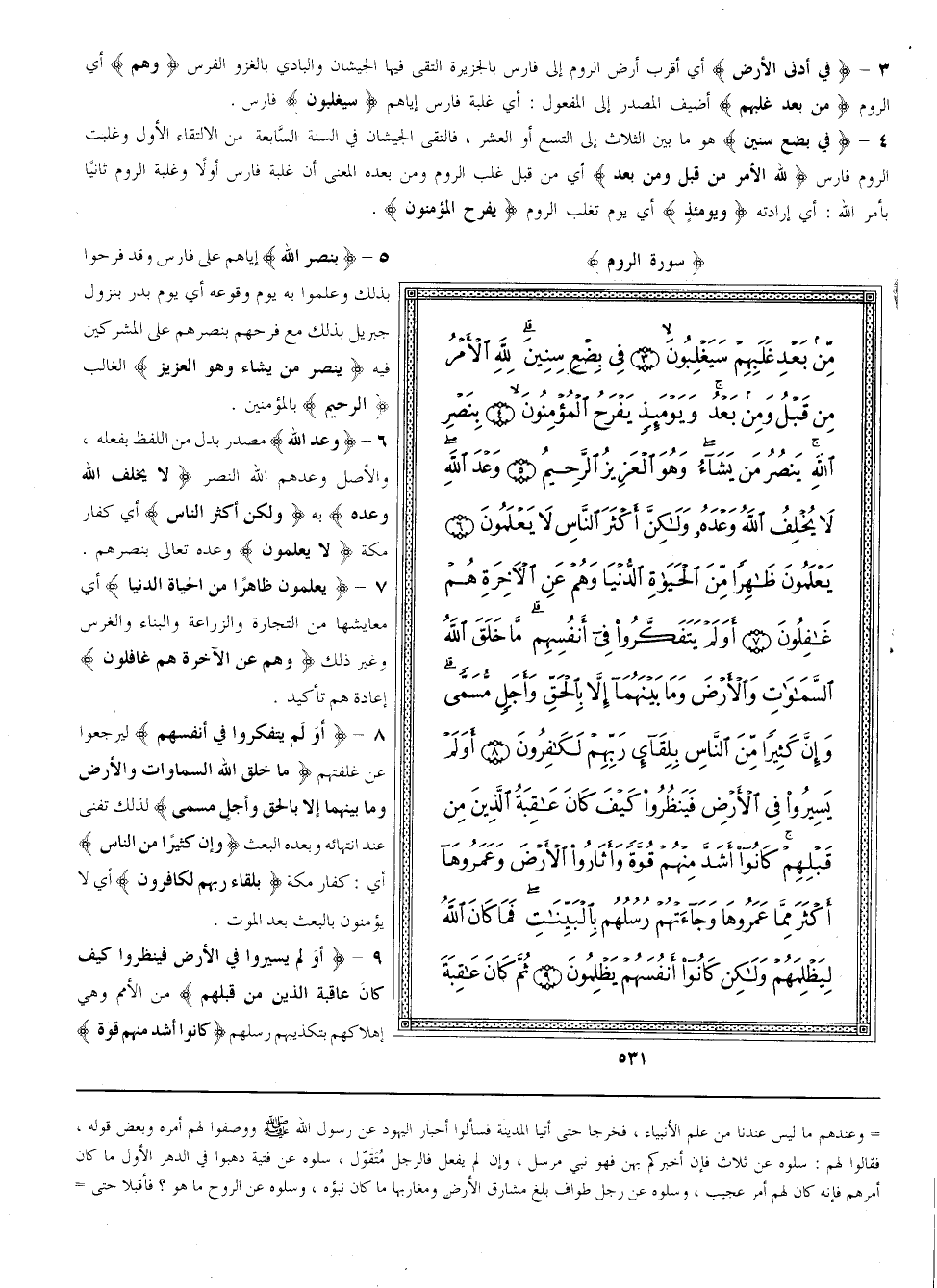 {غُلِبَتْ الرُّوم} وَهُمْ أَهْل الْكِتَاب غَلَبَتْهَا فَارِس وَلَيْسُوا أَهْل كِتَاب بَلْ يَعْبُدُونَ الْأَوْثَان فَفَرِحَ كُفَّار مَكَّة بِذَلِكَ وَقَالُوا لِلْمُسْلِمِينَ نَحْنُ نَغْلِبكُمْ كَمَا غَلَبَتْ فَارِس الرُّوم