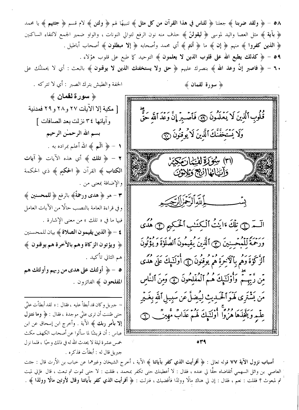هو {هدى ورحمة} بالرفع {للمحسنين} وَفِي قِرَاءَة الْعَامَّة بِالنَّصْبِ حَالًا مِنْ الْآيَات الْعَامِل فِيهَا مَا فِي {تِلْكَ} مِنْ مَعْنَى الإشارة