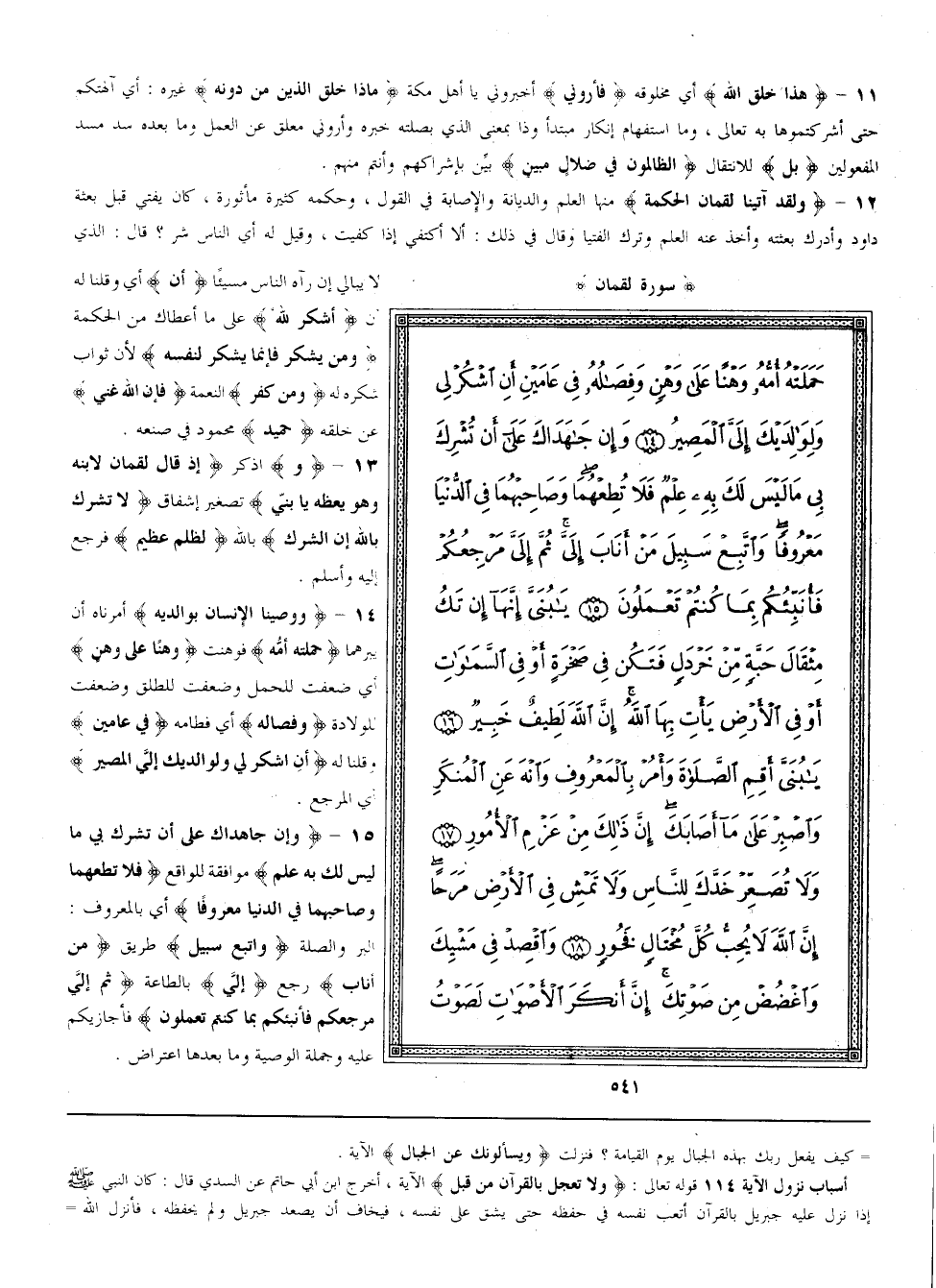 {وَ} اُذْكُرْ {إِذْ قَالَ لُقْمَان لِابْنِهِ وَهُوَ يَعِظهُ يَا بُنَيّ} تَصْغِير إشْفَاق {لَا تُشْرِك بِاَللَّهِ إنَّ الشِّرْك} بِاَللَّهِ {لَظُلْم عَظِيم} فَرَجَعَ إليه وأسلم