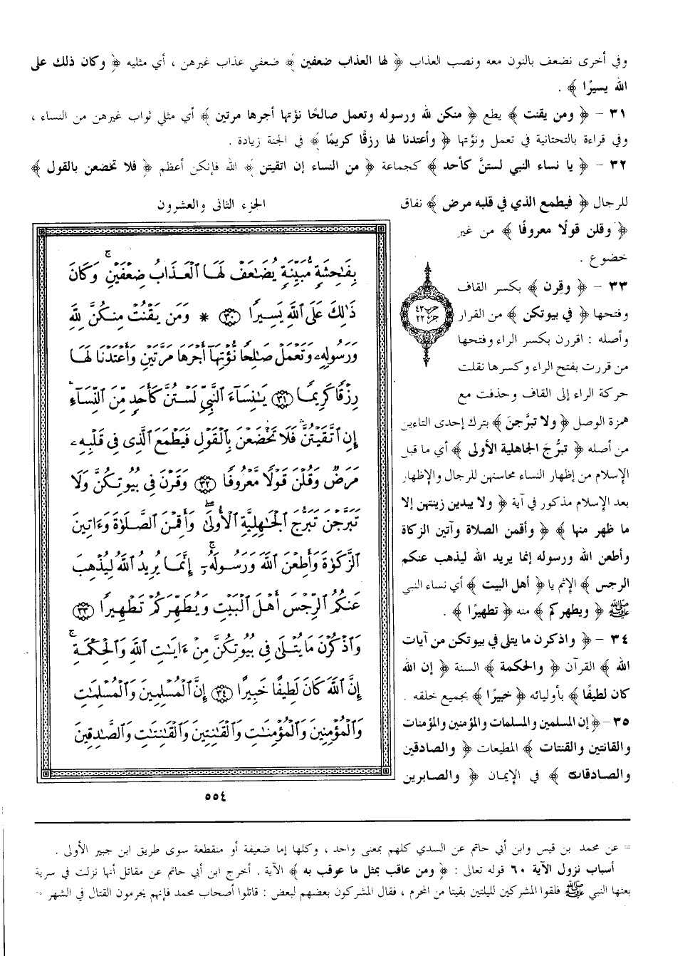 {وَقَرْنَ} بِكَسْرِ الْقَاف وَفَتْحهَا {فِي بُيُوتكُنَّ} مِنْ الْقَرَار وَأَصْله أَقْرِرْنَ بِكَسْرِ الرَّاء وَفَتْحهَا مِنْ قَرَرْت بِفَتْحِ الرَّاء وَكَسْرهَا نُقِلَتْ حَرَكَة الرَّاء إلَى الْقَاف وَحُذِفَتْ مَعَ هَمْزَة الْوَصْل {وَلَا تَبَرَّجْنَ} بِتَرْكِ إحْدَى التَّاءَيْنِ مِنْ أَصْله {تَبَرُّج الْجَاهِلِيَّة الْأُولَى} أَيْ مَا قَبْل الْإِسْلَام مِنْ إظْهَار النِّسَاء مَحَاسِنهنَّ لِلرِّجَالِ وَالْإِظْهَار بَعْد الْإِسْلَام مَذْكُور فِي آيَة {وَلَا يُبْدِينَ زِينَتهنَّ إلَّا مَا ظَهَرَ مِنْهَا} {وَأَقِمْنَ الصَّلَاة وَآتِينَ الزَّكَاة وَأَطِعْنَ اللَّه وَرَسُوله إنَّمَا يُرِيد اللَّه لِيُذْهِب عَنْكُمْ الرِّجْس} الْإِثْم يَا {أَهْل الْبَيْت} أَيْ نِسَاء النَّبِيّ صَلَّى اللَّه عَلَيْهِ وَسَلَّمَ {وَيُطَهِّركُمْ} منه {تطهيرا}