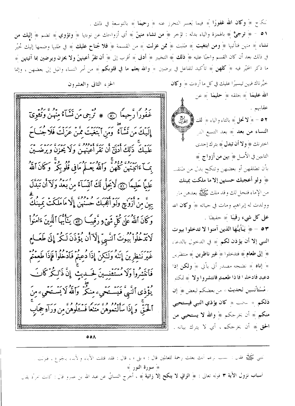 {ترجيء} بِالْهَمْزَةِ وَالْيَاء بَدَله تُؤَخِّر {مَنْ تَشَاء مِنْهُنَّ} أَيْ أَزْوَاجك عَنْ نَوْبَتهَا {وَتُؤْوِي} تَضُمّ {إلَيْك مَنْ تَشَاء} مِنْهُنَّ فَتَأْتِيهَا {وَمَنْ ابْتَغَيْت} طَلَبْت {مِمَّنْ عَزَلْت} مِنْ الْقِسْمَة {فَلَا جُنَاح عَلَيْك} فِي طَلَبهَا وَضَمّهَا إلَيْك خَيْر فِي ذَلِكَ بَعْد أَنْ كَانَ الْقَسْم وَاجِبًا عَلَيْهِ {ذَلِكَ} التَّخْيِير {أَدْنَى} أَقْرَب إلَى {أَنْ تَقَرّ أَعْيُنهنَّ ولا يحزن ويرضين بِمَا آتَيْتهنَّ} مَا ذَكَرَ الْمُخَيَّر فِيهِ {كُلّهنَّ} تَأْكِيد لِلْفَاعِلِ فِي يَرْضَيْنَ {وَاَللَّه يَعْلَم مَا فِي قُلُوبكُمْ} مِنْ أَمْر النِّسَاء وَالْمَيْل إلَى بَعْضهنَّ وَإِنَّمَا خَيَّرْنَاك فِيهِنَّ تَيْسِيرًا عَلَيْك فِي كُلّ مَا أَرَدْت {وَكَانَ اللَّه عَلِيمًا} بِخَلْقِهِ {حليما} عن عقابهم