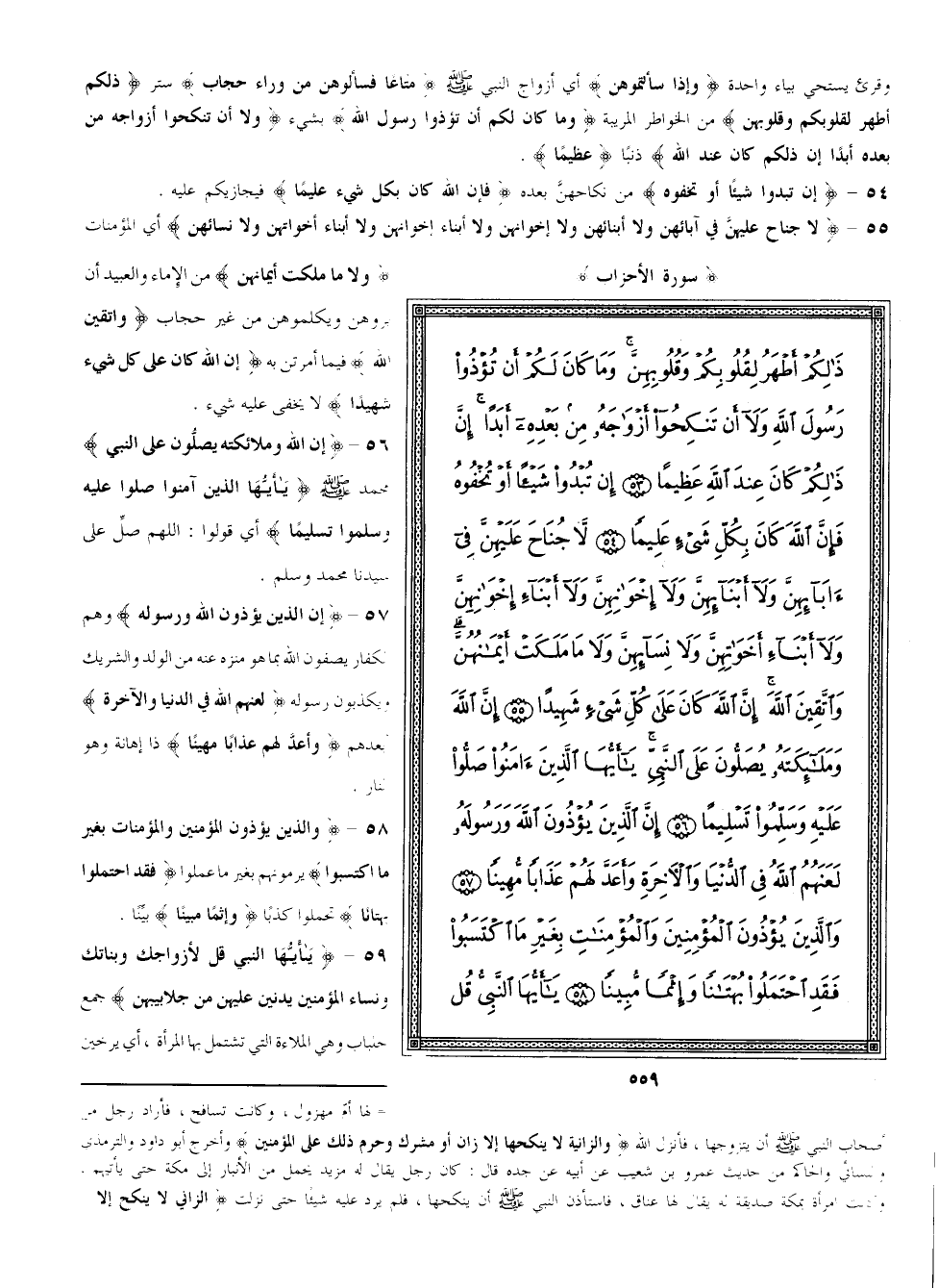{يأيها الَّذِينَ آمَنُوا لَا تَدْخُلُوا بُيُوت النَّبِيّ إلَّا أَنْ يُؤْذَن لَكُمْ} فِي الدُّخُول بِالدُّعَاءِ {إلَى طَعَام} فَتَدْخُلُوا {غَيْر نَاظِرِينِ} مُنْتَظِرِينَ {إنَاهُ} نُضْجه مَصْدَر أَنِيَ يَأْنِي {وَلَكِنْ إذَا دُعِيتُمْ فَادْخُلُوا فَإِذَا طَعِمْتُمْ فَانْتَشِرُوا وَلَا} تَمْكُثُوا {مُسْتَأْنِسِينَ لِحَدِيثٍ} مِنْ بَعْضكُمْ لِبَعْضٍ {إنَّ ذَلِكُمْ} الْمُكْث {كَانَ يؤذي النبي فيستحيي منكم} أن يخرجكم {والله لا يستحيي مِنْ الْحَقّ} أَنْ يُخْرِجكُمْ أَيْ لَا يَتْرُك بيانه وقريء يَسْتَحْيِ بِيَاءٍ وَاحِدَة {وَإِذَا سَأَلْتُمُوهُنَّ} أَيْ أَزْوَاج النَّبِيّ صَلَّى اللَّه عَلَيْهِ وَسَلَّمَ {مَتَاعًا فَسْأَلُوهُنَّ مِنْ وَرَاء حِجَاب} سِتْر {ذَلِكُمْ أَطْهَر لِقُلُوبِكُمْ وَقُلُوبهنَّ} مِنْ الْخَوَاطِر الْمُرِيبَة {وَمَا كَانَ لَكُمْ أَنْ تُؤْذُوا رَسُول اللَّه} بِشَيْءٍ {وَلَا أَنْ تَنْكِحُوا أَزْوَاجه مِنْ بَعْده أَبَدًا إنَّ ذَلِكُمْ كان عند الله} ذنبا {عظيما}