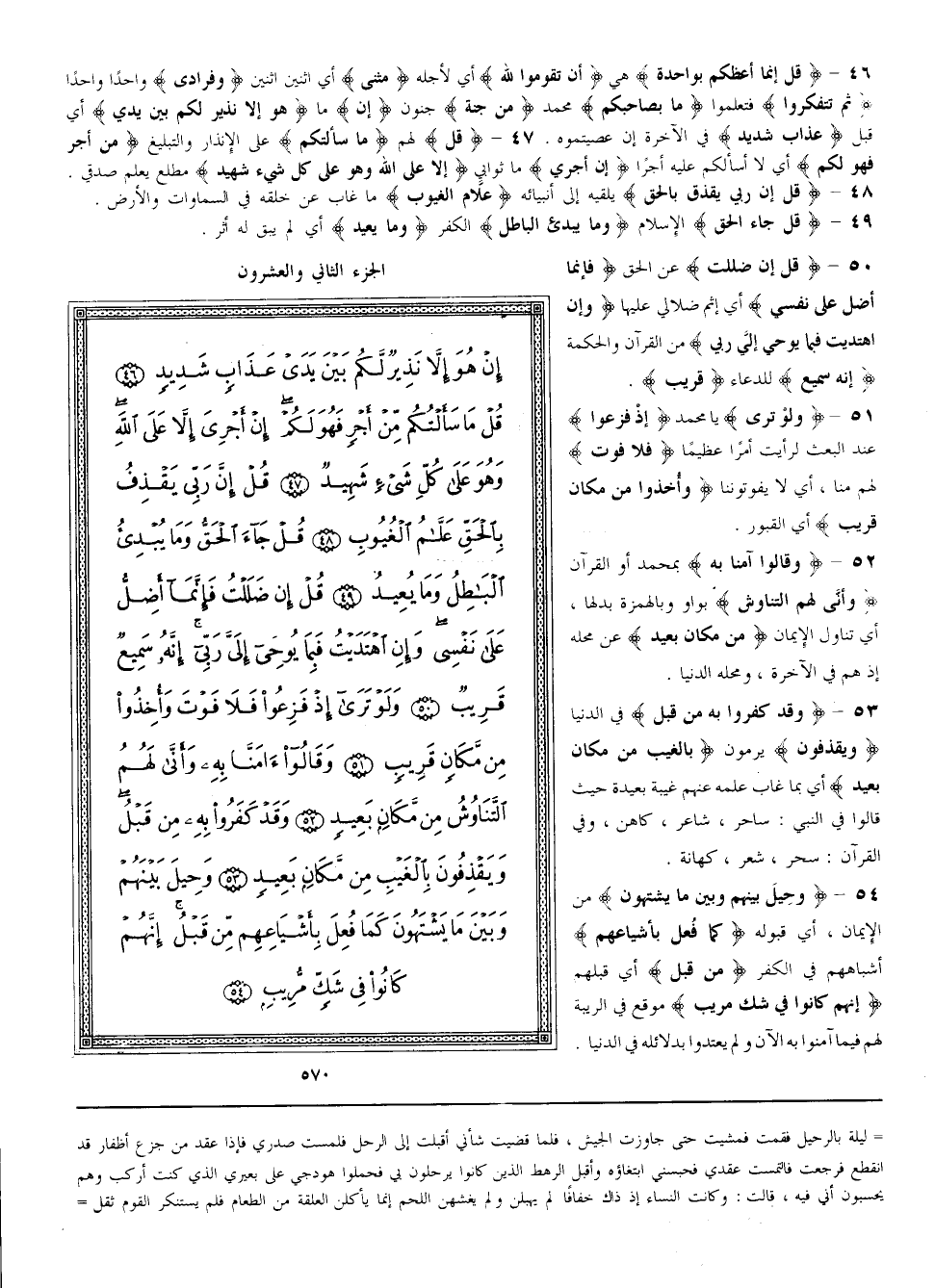{قُلْ إنَّمَا أَعِظكُمْ بِوَاحِدَةٍ} هِيَ {أَنْ تَقُومُوا لِلَّهِ} أَيْ لِأَجْلِهِ {مَثْنَى} أَيْ اثْنَيْنِ اثْنَيْنِ {وَفُرَادَى} وَاحِدًا وَاحِدًا {ثُمَّ تَتَفَكَّرُوا} فَتَعْلَمُوا {مَا بِصَاحِبِكُمْ} مُحَمَّد {مِنْ جِنَّة} جُنُون {إنْ} مَا {هُوَ إلَّا نَذِير لَكُمْ بَيْن يَدَيْ} أَيْ قَبْل {عَذَاب شَدِيد} فِي الْآخِرَة إنْ عَصَيْتُمُوهُ