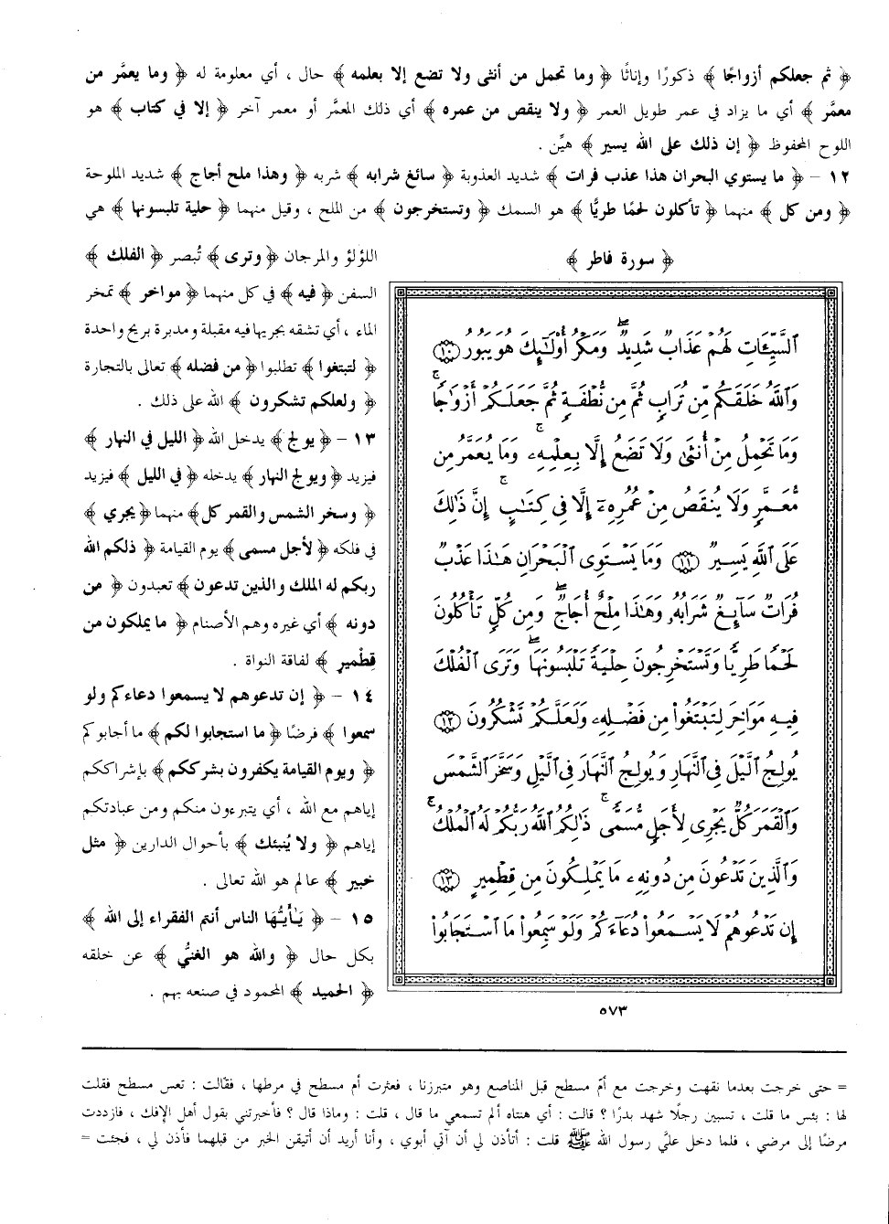 {وما يستوي البحران هذا عذب فُرَات} شَدِيد الْعُذُوبَة {سَائِغ شَرَابه} شُرْبه {وَهَذَا مِلْح أُجَاج} شَدِيد الْمِلْوَحَة {وَمِنْ كُلّ} مِنْهُمَا {تَأْكُلُونَ لَحْمًا طَرِيًّا} هُوَ السَّمَك {وَتَسْتَخْرِجُونَ} مِنْ الْمِلْح وَقِيلَ مِنْهُمَا {حِلْيَة تَلْبَسُونَهَا} هِيَ اللُّؤْلُؤ وَالْمَرْجَان {وَتَرَى} تُبْصِر {الْفُلْك} السُّفُن {فِيهِ} فِي كُلّ مِنْهُمَا {مَوَاخِر} تَمْخُر الْمَاء أَيْ تَشُقّهُ بِجَرْيِهَا فِيهِ مُقْبِلَة وَمُدْبِرَة بِرِيحٍ وَاحِدَة {لِتَبْتَغُوا} تَطْلُبُوا {مِنْ فَضْله} تَعَالَى بِالتِّجَارَةِ {وَلَعَلَّكُمْ تَشْكُرُونَ} اللَّه عَلَى ذَلِكَ