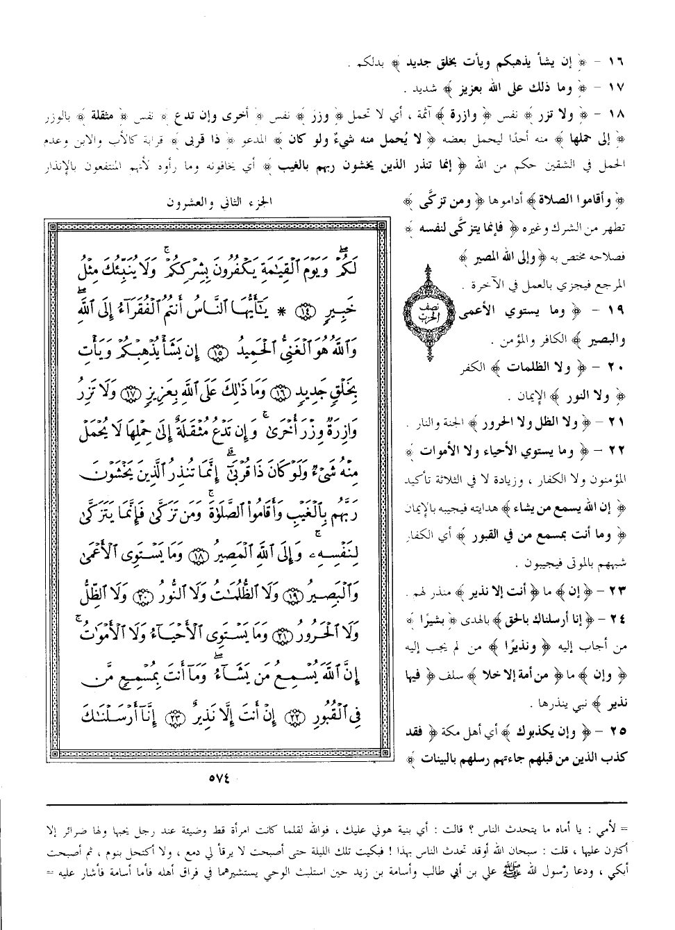 {وَلَا تَزِر} نَفْس {وَازِرَة} آثِمَة أَيْ لَا تَحْمِل {وِزْر} نَفْس {أُخْرَى وَإِنْ تَدْعُ} نَفْس {مُثْقَلَة} بِالْوِزْرِ {إلَى حِمْلهَا} مِنْهُ أَحَدًا لِيَحْمِل بَعْضه {لَا يُحْمَل مِنْهُ شَيْء وَلَوْ كَانَ} الْمَدْعُوّ {ذَا قُرْبَى} قَرَابَة كَالْأَبِ وَالِابْن وَعَدَم الْحَمْل فِي الشِّقَّيْنِ حُكْم مِنْ اللَّه {إنَّمَا تُنْذِر الَّذِينَ يَخْشَوْنَ رَبّهمْ بِالْغَيْبِ} أَيْ يَخَافُونَهُ وَمَا رَأَوْهُ لِأَنَّهُمْ الْمُنْتَفِعُونَ بِالْإِنْذَارِ {وَأَقَامُوا الصَّلَاة} أَدَامُوهَا {وَمَنْ تَزَكَّى} تَطَهَّرَ مِنْ الشِّرْك وَغَيْره {فَإِنَّمَا يَتَزَكَّى لِنَفْسِهِ} فَصَلَاحه مُخْتَصّ بِهِ {وَإِلَى اللَّه الْمَصِير} الْمَرْجِع فَيَجْزِي بِالْعَمَلِ فِي الْآخِرَة
