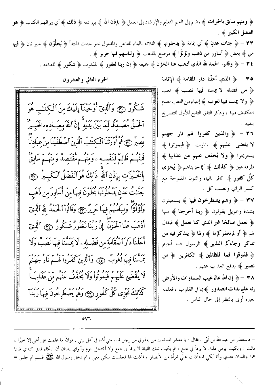 {ثُمَّ أَوْرَثْنَا} أَعْطَيْنَا {الْكِتَاب} الْقُرْآن {الَّذِينَ اصْطَفَيْنَا مِنْ عِبَادنَا} وَهُمْ أُمَّتك {فَمِنْهُمْ ظَالِم لِنَفْسِهِ} بِالتَّقْصِيرِ فِي الْعَمَل بِهِ {وَمِنْهُمْ مُقْتَصِد} يَعْمَل بِهِ أَغْلَب الْأَوْقَات {وَمِنْهُمْ سَابِق بِالْخَيْرَاتِ} يَضُمّ إلَى الْعِلْم التَّعْلِيم وَالْإِرْشَاد إلَى الْعَمَل {بِإِذْنِ الله} بإرادته {ذلك} أي إيراثهم الكتاب {هو الفضل الكبير}