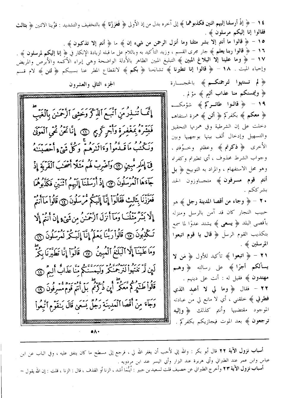 {وَاضْرِبْ} اجْعَلْ {لَهُمْ مَثَلًا} مَفْعُول أَوَّل {أَصْحَاب} مَفْعُول ثَانٍ {الْقَرْيَة} أَنْطَاكِيَّة {إذْ جَاءَهَا} إلَى آخِره بَدَل اشْتِمَال مِنْ أَصْحَاب الْقَرْيَة {الْمُرْسَلُونَ} أَيْ رُسُل عِيسَى