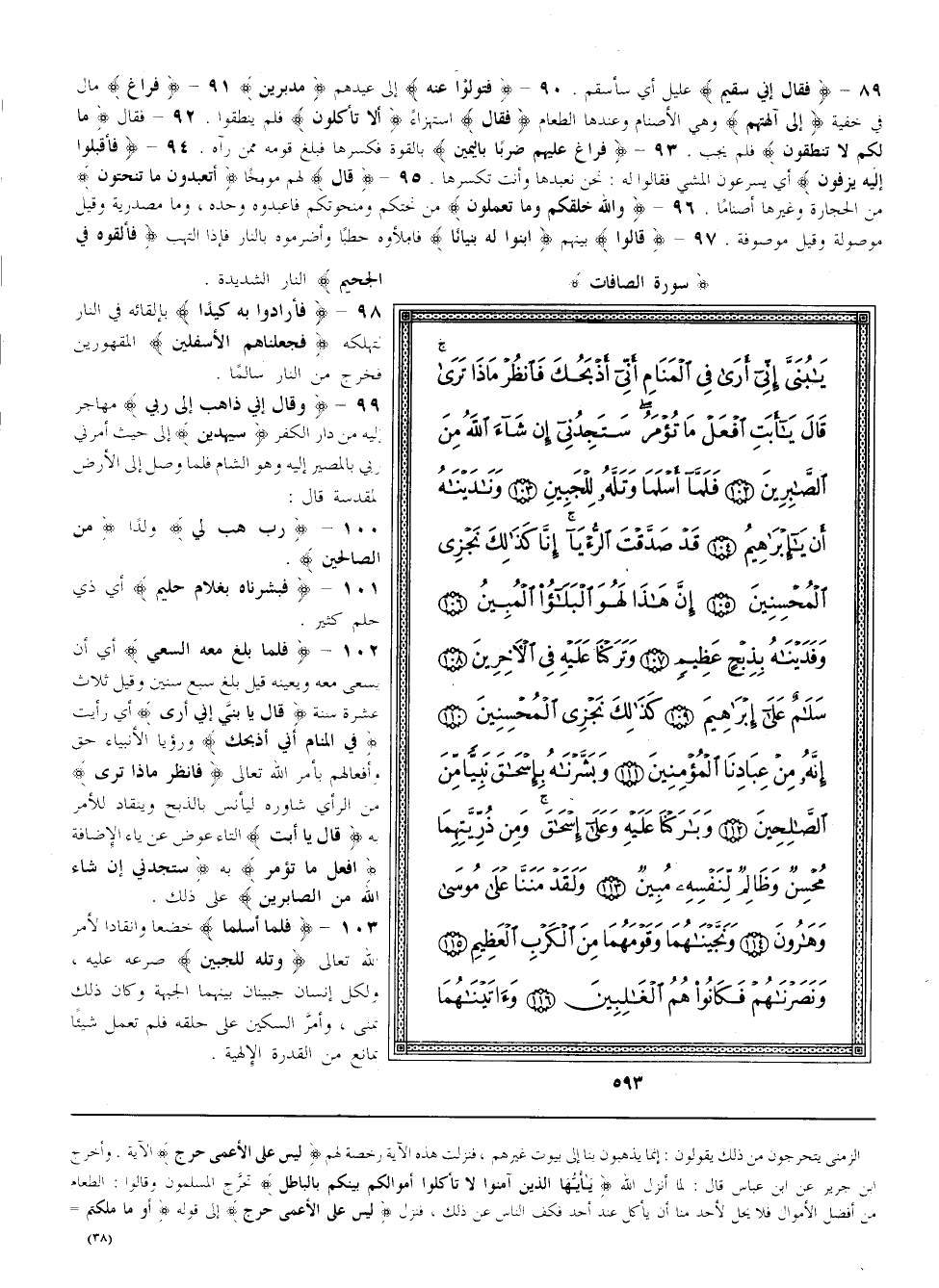 {فَلَمَّا بَلَغَ مَعَهُ السَّعْي} أَيْ أَنْ يَسْعَى مَعَهُ وَيُعِينهُ قِيلَ بَلَغَ سَبْع سِنِينَ وَقِيلَ ثَلَاث عَشْرَة سَنَة {قَالَ يَا بُنَيّ إنِّي أَرَى} أَيْ رَأَيْت {فِي الْمَنَام أَنِّي أَذْبَحك} وَرُؤْيَا الْأَنْبِيَاء حَقّ وَأَفْعَالهمْ بِأَمْرِ اللَّه تَعَالَى {فَانْظُرْ مَاذَا تَرَى} مِنْ الرَّأْي شَاوَرَهُ لِيَأْنَس بِالذَّبْحِ وَيَنْقَاد لِلْأَمْرِ بِهِ {قَالَ يَا أَبَتِ} التَّاء عِوَض عَنْ يَاء الْإِضَافَة {افْعَلْ مَا تُؤْمَر} بِهِ {سَتَجِدُنِي إنْ شَاءَ اللَّه مِنَ الصَّابِرِينَ} عَلَى ذَلِكَ